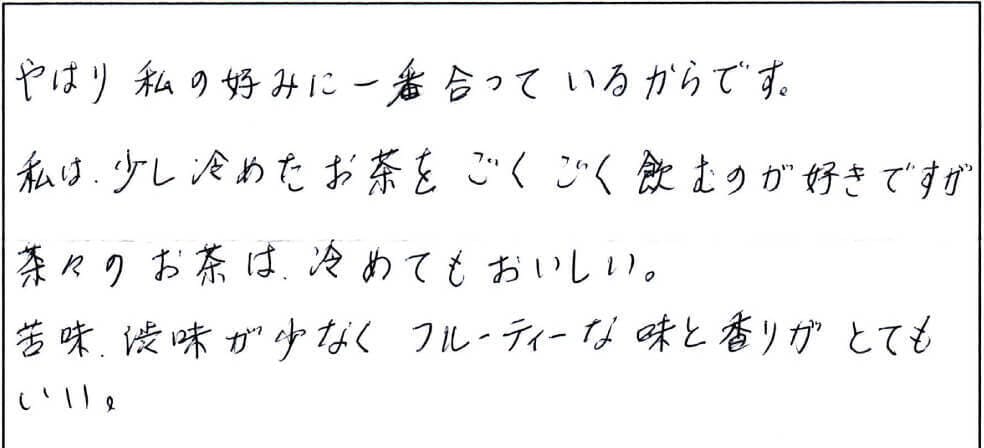 やはり私の好みに一番合っているからです。私は少し冷めたお茶をごくごく飲むのが好きですが、茶々(尚茶堂)のお茶は、冷めてもおいしい。 苦味、渋味が少なくフルーティーな味と香りがとてもいい。