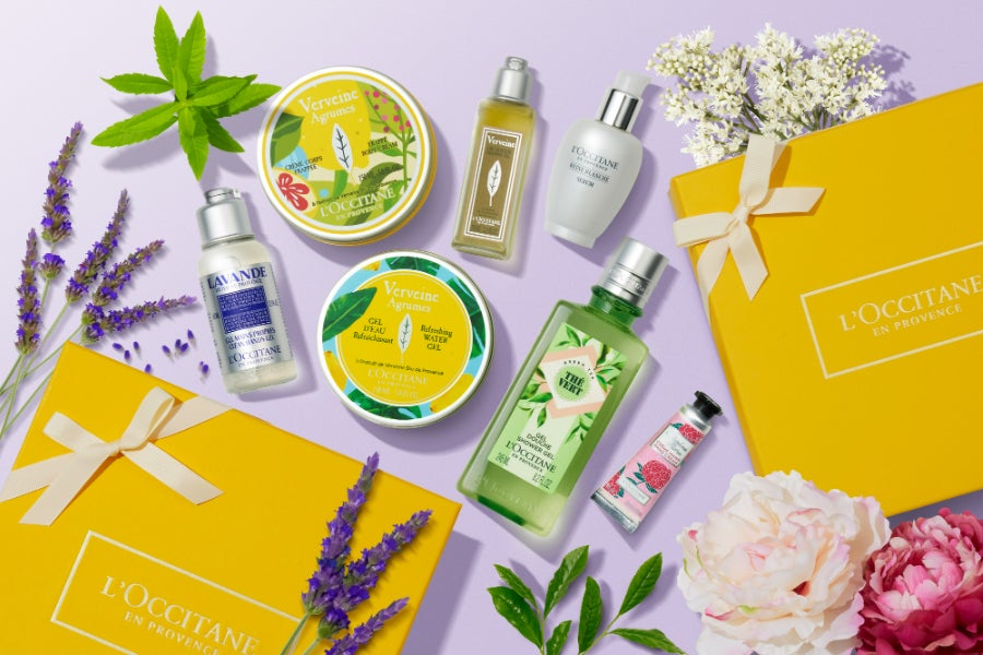 5,000円のセット:ギフトボックス入り、7,600円相当のロクシタン製品とお礼状(ラベンダー クリーン ハンドジェル 65ML、シトラスヴァーベナ ボディジェリー150ML、ヴァーベナ シャワージェル 70ML、ピオニー フェアリーハンドクリーム 10ML)