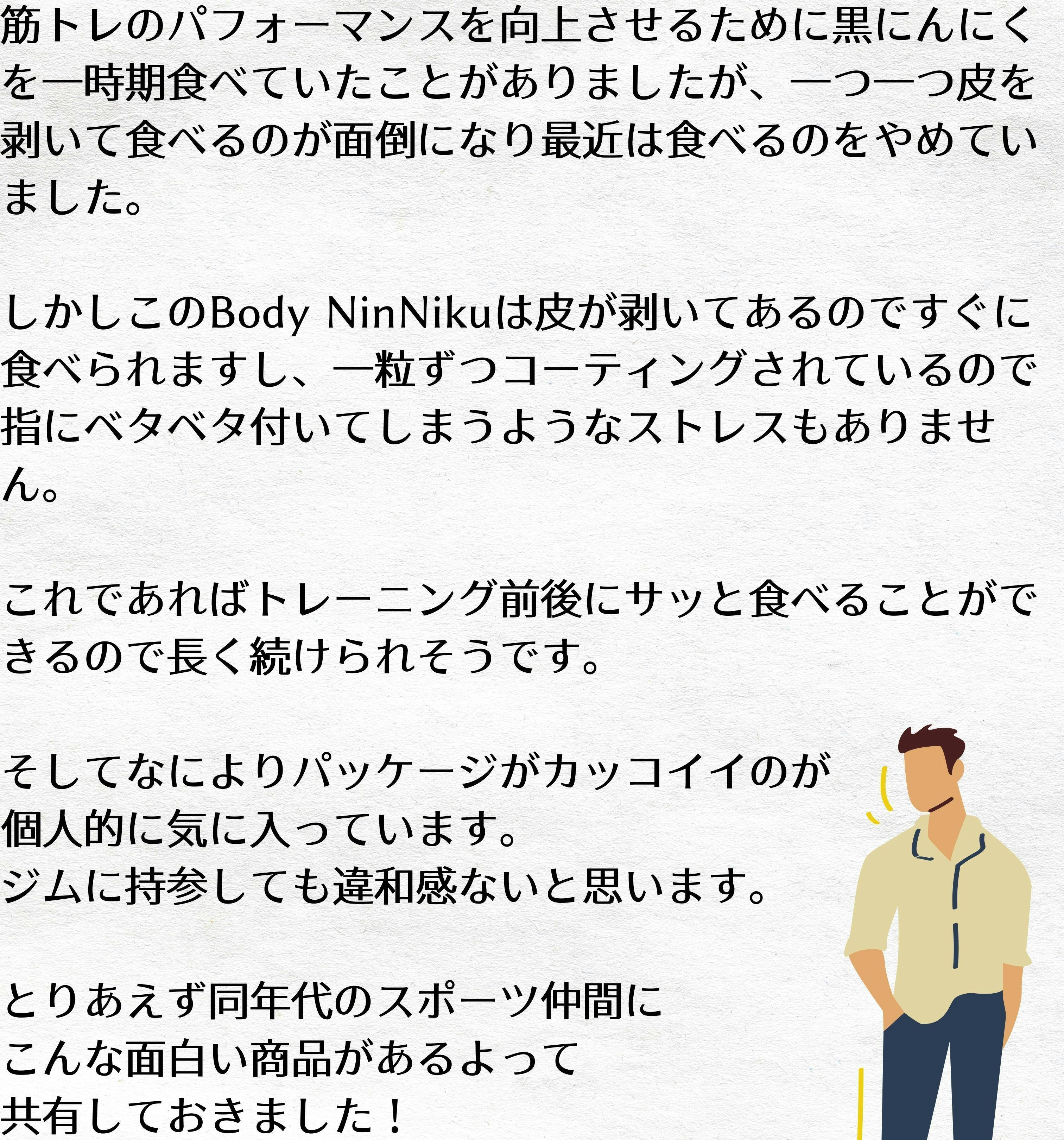 「Body NinNiku KURO.」は筋トレやスポーツなどのフィットネスと一緒に食べることのできる新しい黒にんにくです。