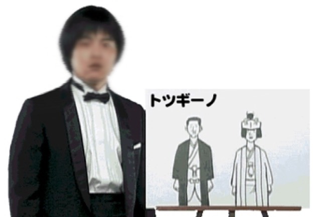 アフロの髪を整えーの、白いシャツを着てーの、蝶ネクタイを締めてーの、トツギーノ