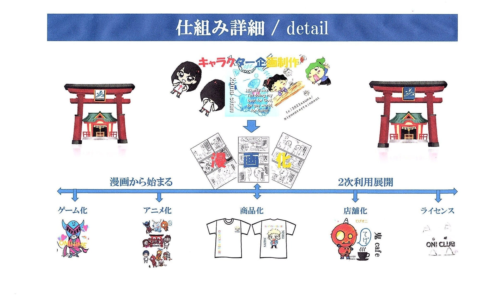 私たちは宮崎の各地区を舞台にしたキャラクターコンテンツを生み出しコミックを皮切りにアニメ、ゲーム、グッズ販売など、2次利用展開に特化した、キャラクタービジネスのモデルをフルに活用し宮崎の財産であると言えるものを創り地域活性化に貢献していく所存です。