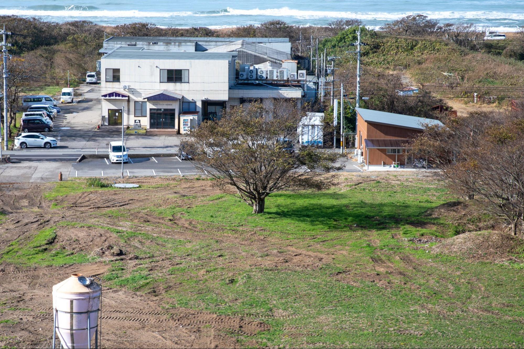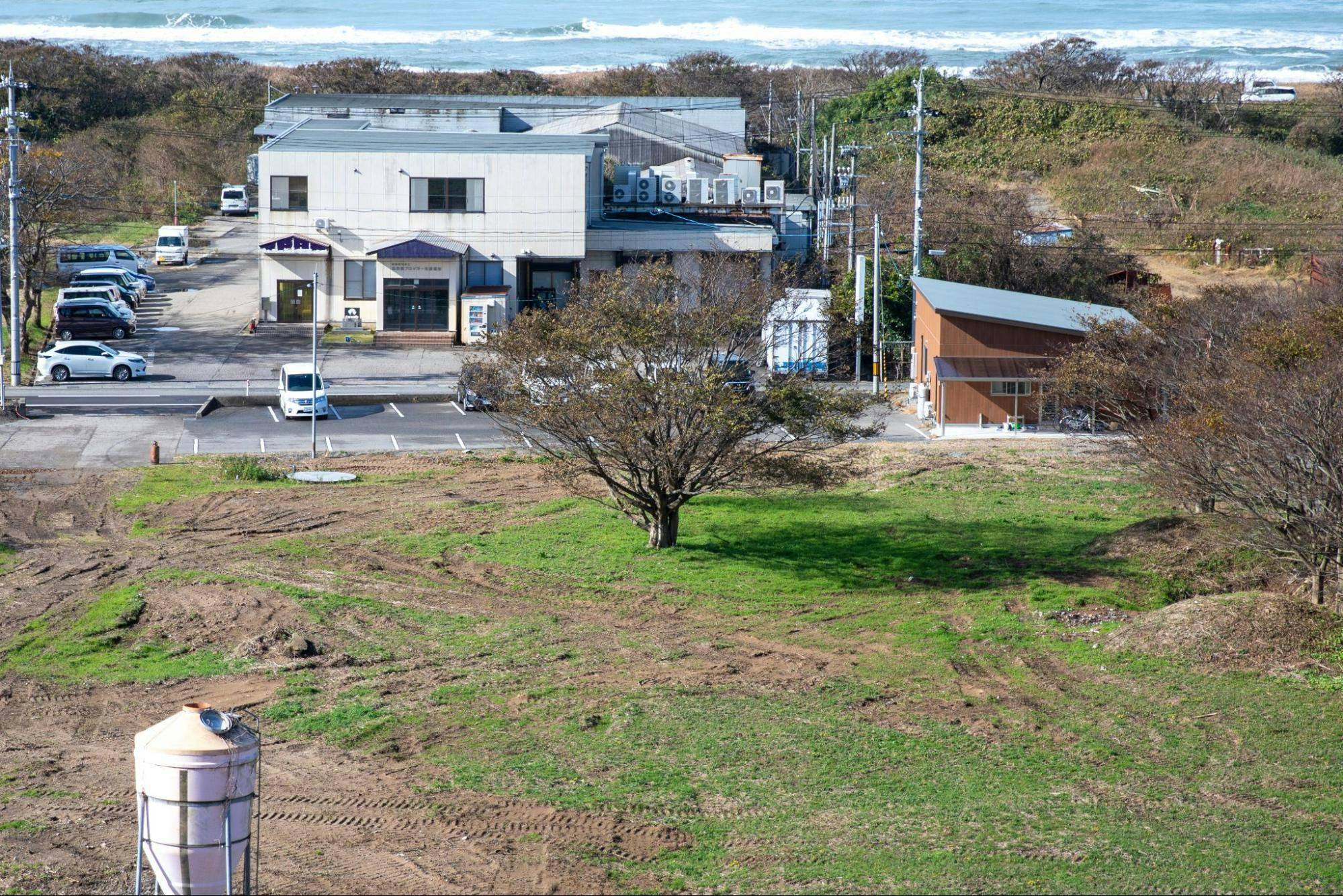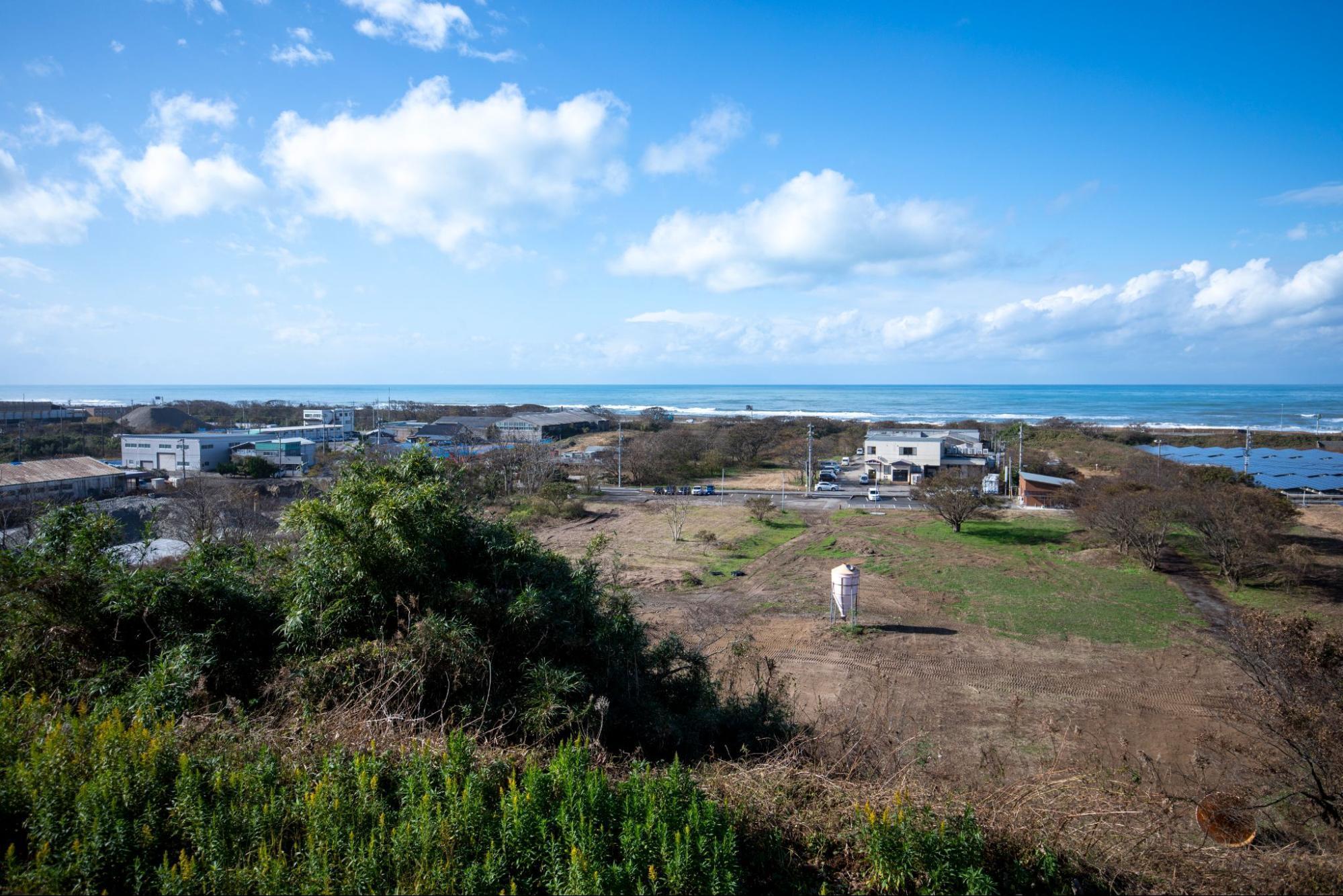 私設公園として開放する予定の5000坪の敷地。鶏舎はすでに取り壊されているが、広場の中央にサイロの名残が見える。奥には内灘が広がる。