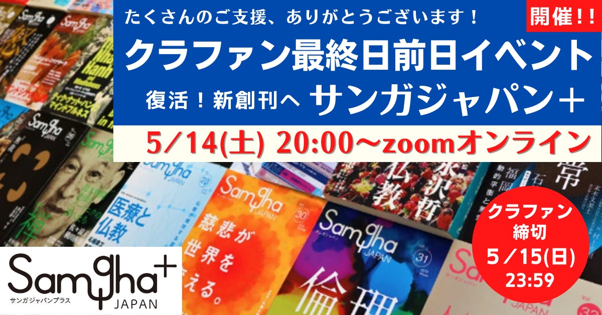 多くの皆さんに仏教雑誌『サンガジャパン+』の新創刊について知っていただくために、クラファン最終日前日の「5月14日(土)20時」に「『サンガジャパン+』新創刊クラウドファンディング 最終日イブ企画スペシャルZOOMミーティング」を開催します!