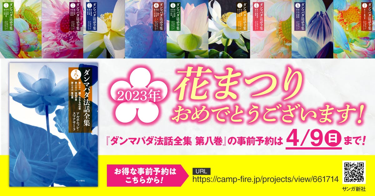 そしてこの素晴らしい日に、サンガ新社では、お釈迦様が真理の教えを説かれた初期仏教経典『ダンマパダ』を、アルボムッレ・スマナサーラ長老が解説する紙書籍『ダンマパダ法話全集 第八巻』の事前予約クラウドファンディングを実施することができています。