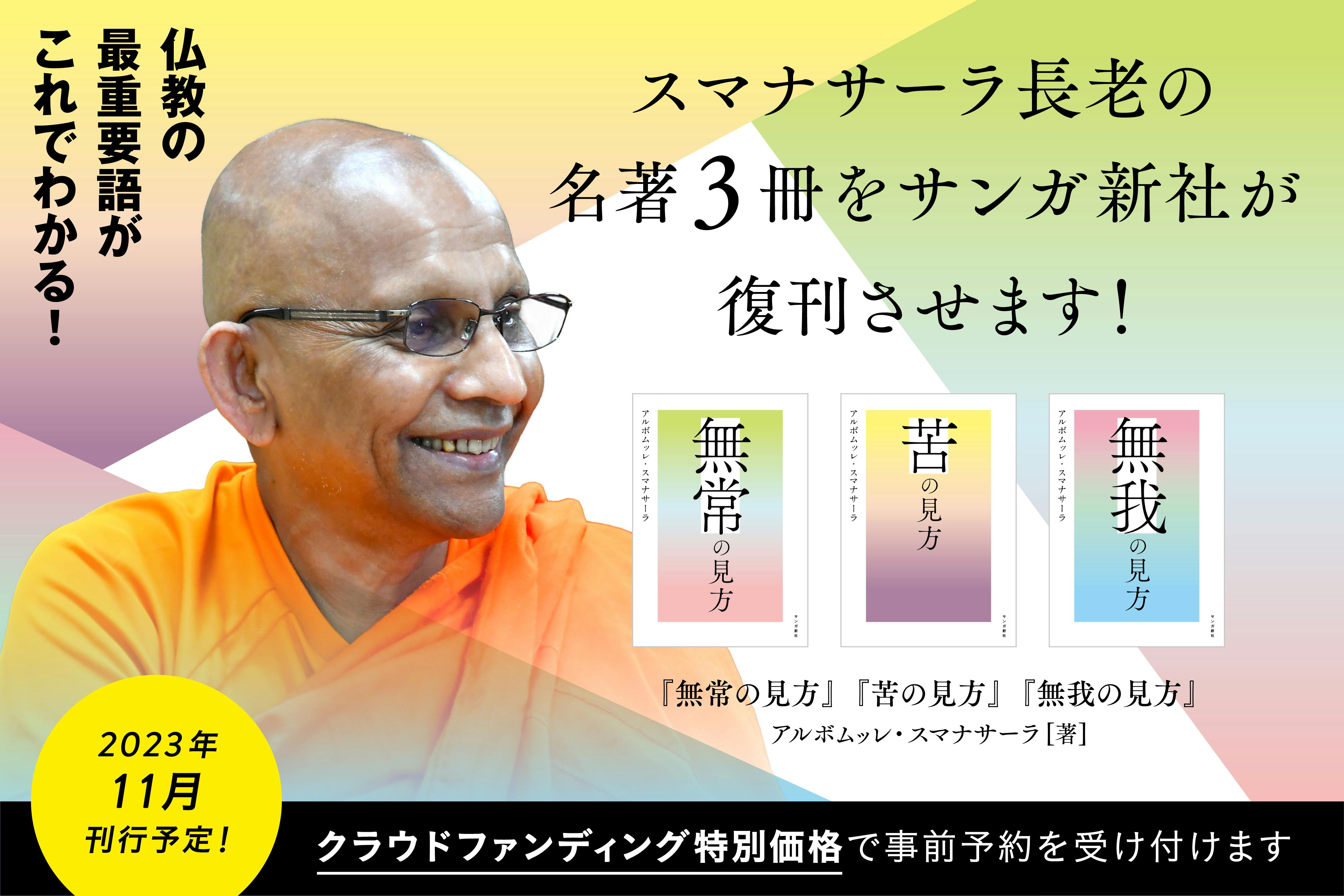 さてサンガ新社では、創立3年目の最初のクラウドファンディングとして、アルボムッレ・スマナサーラ長老の名著『無常の見方』『苦の見方』『無我の見方』を復刊し、お得な事前予約を受け付けることにいたしました。