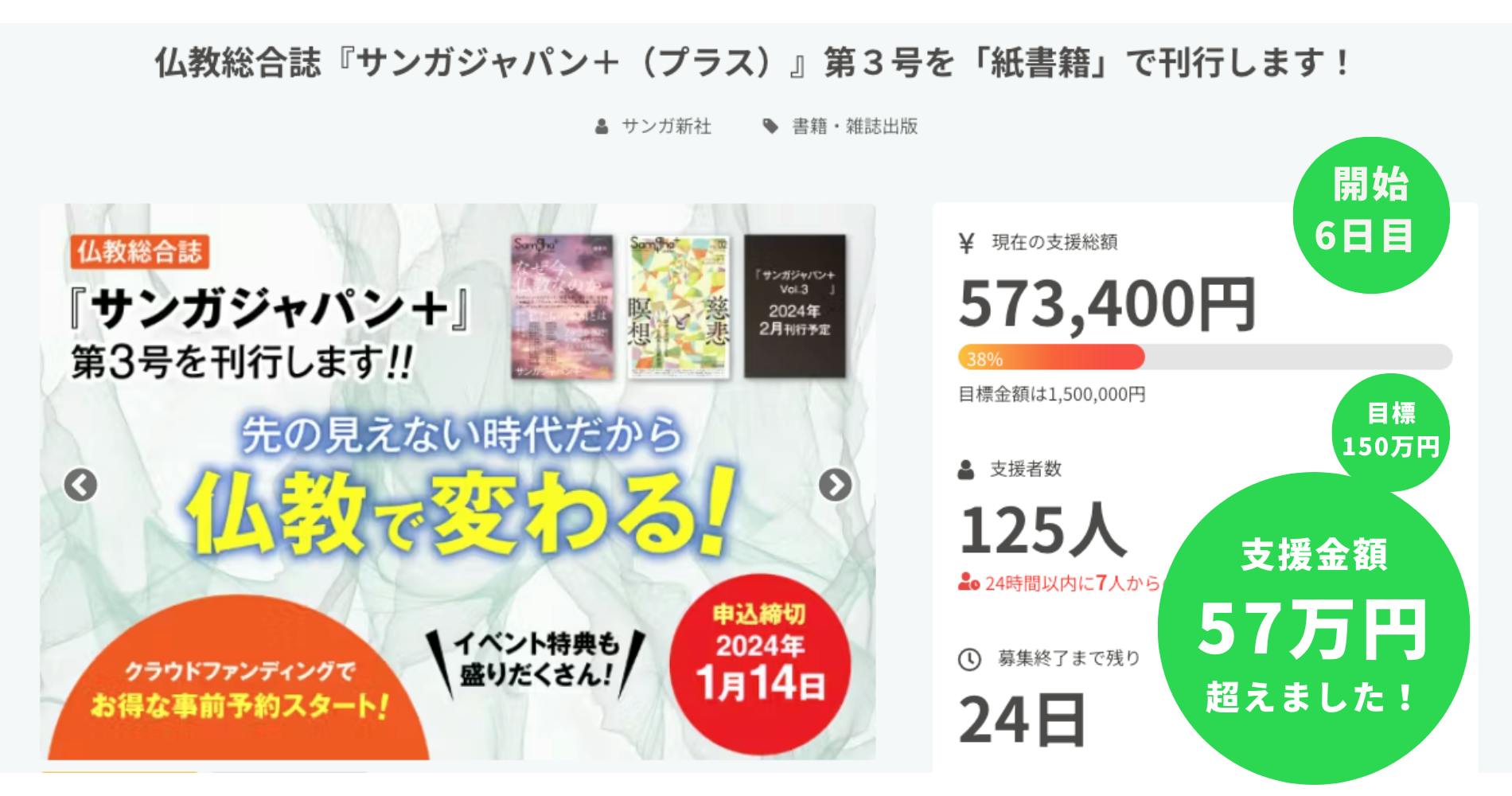 「仏教総合誌『サンガジャパン+(プラス)』第3号を「紙書籍」で刊行します!」クラウドファンディングは、12月21日(木)に6日目を迎えました。