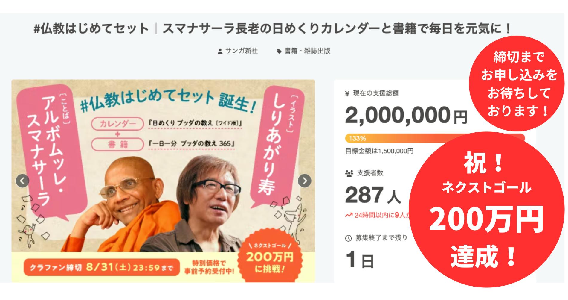 「#仏教はじめてセット|スマナサーラ長老の日めくりカレンダーと書籍で毎日を元気に!」クラウドファンディングは、目標金額150万円を突破しながらも、さらに多くの方々に仏教の力をお届けしたいという想いから、ネクストゴール「支援金額200万円」を掲げて活動を続けてきました。