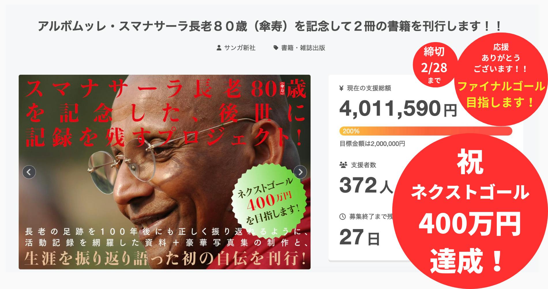 12月28日(土)にスタートした「アルボムッレ・スマナサーラ長老80歳(傘寿)を記念して2冊の書籍を刊行します!!」クラウドファンディングは、皆さまからの心のこもった応援のおかげで、2月1日(土)に「ネクストゴール400万円」を達成することができました!