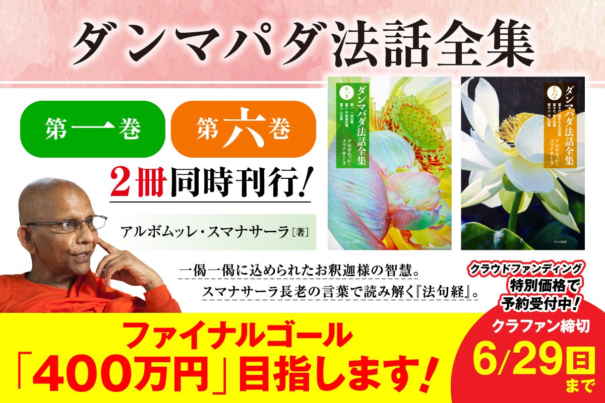 スマナサーラ長老が、私たちにわかる日本語でお釈迦様の智慧を説いてくださった『ダンマパダ法話全集』は、まさに同時代の奇跡ともいえる一冊です。この貴重な書籍を、さらに多くの方に届けるために、皆さんと一緒にこのプロジェクトを盛り上げていけたら、心から嬉しく思います。