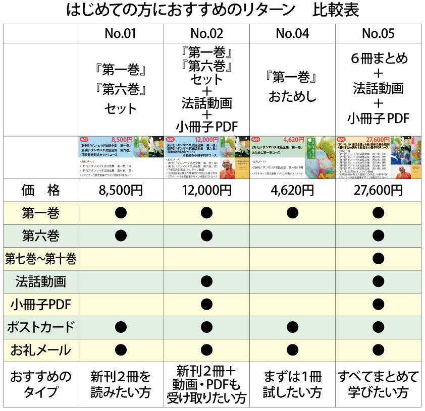 どのリターンを選んでも、『ダンマパダ法話全集』に出会っていただく入り口としてふさわしい内容です。どうぞご自身のペースにあったリターンをお選びください。