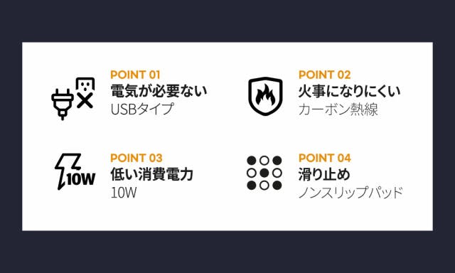 電力がコンセントからではないため、コンセントタイプの電気マットと比較すると暖かさが弱く感じる場合がございます。
