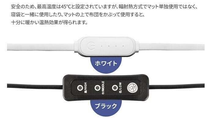 JPホットマットは安全のために最高温度45℃に設定されていますが、輻射熱方式でマット単独使用ではなく、寝袋と一緒に使用したり、マットの上で布団をかぶって使用すると、十分に暖かい温熱効果を感じることができます。