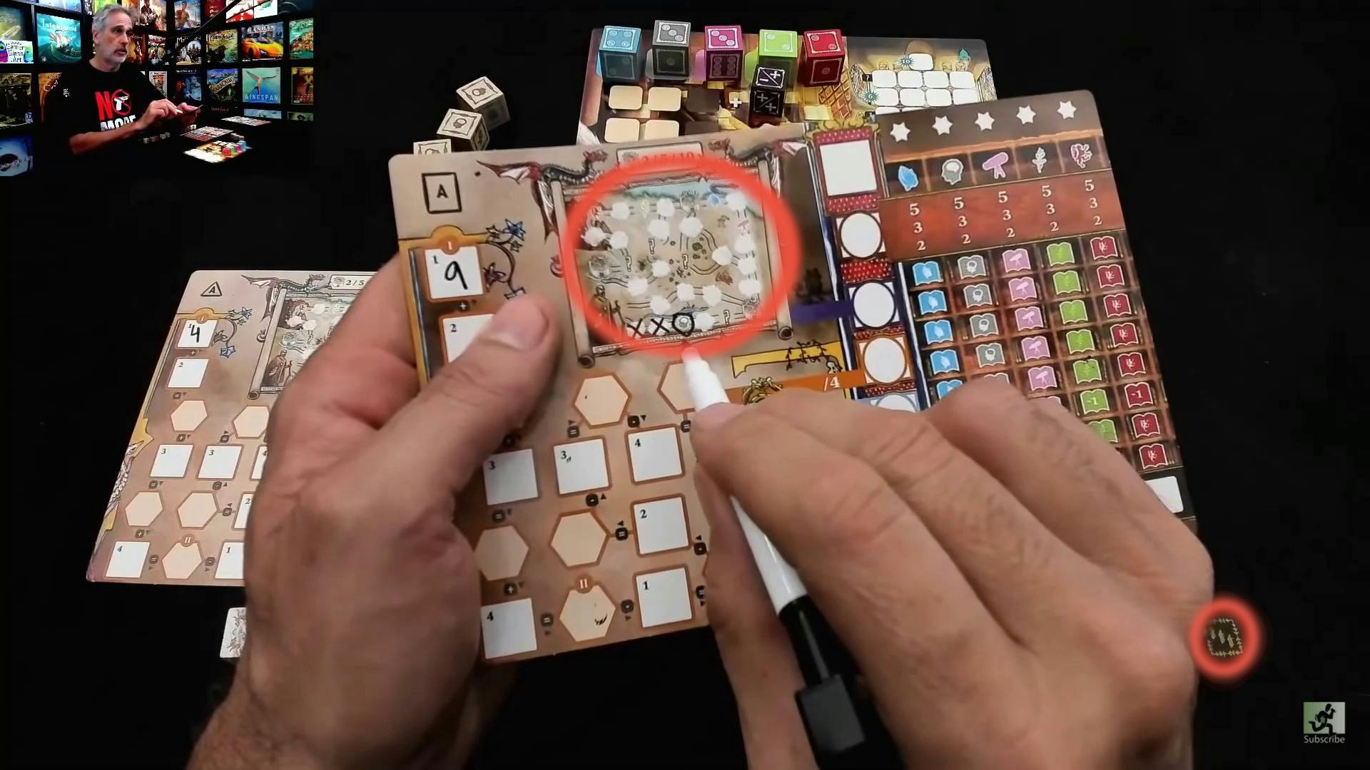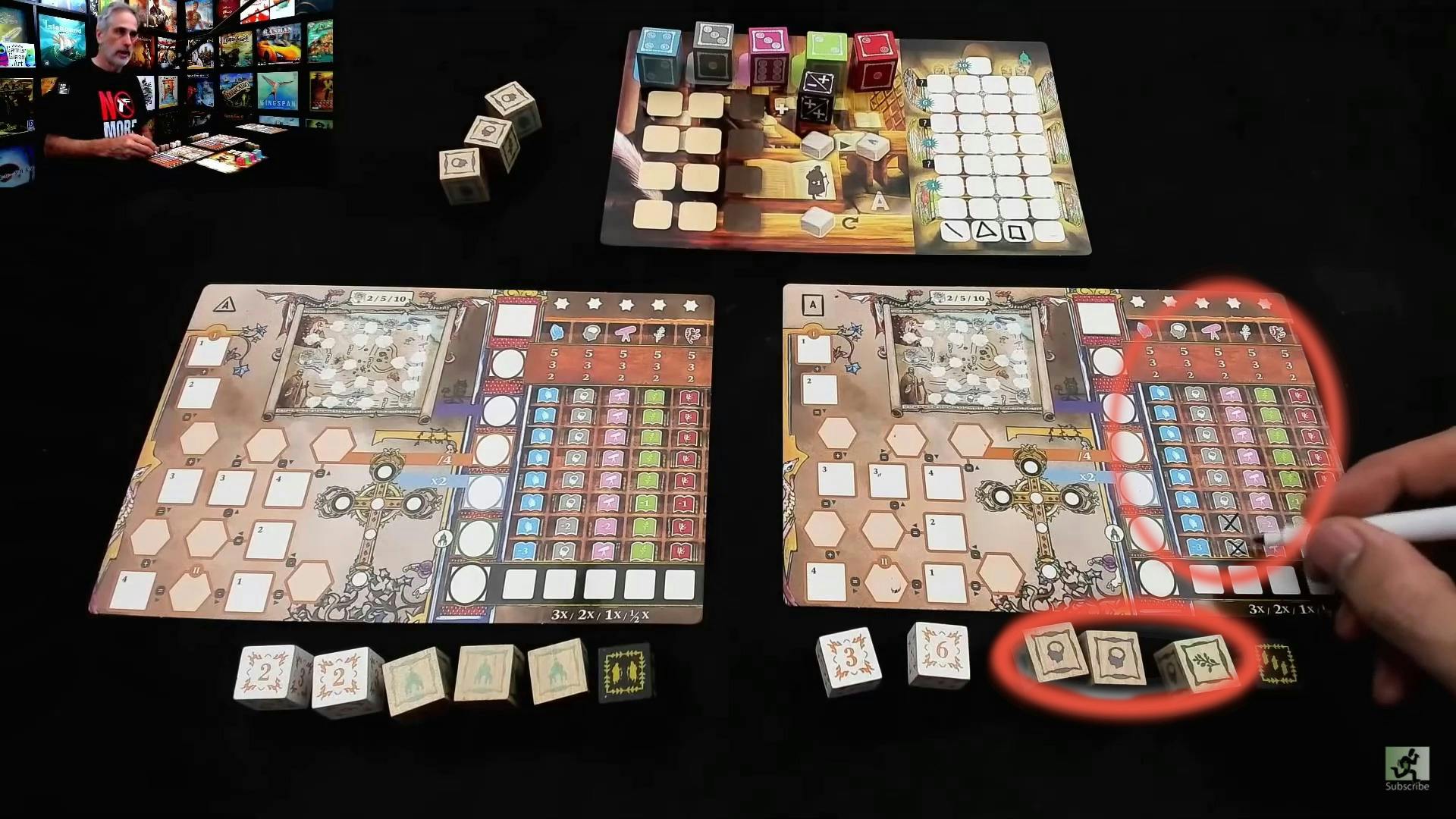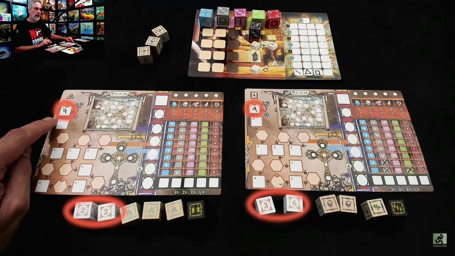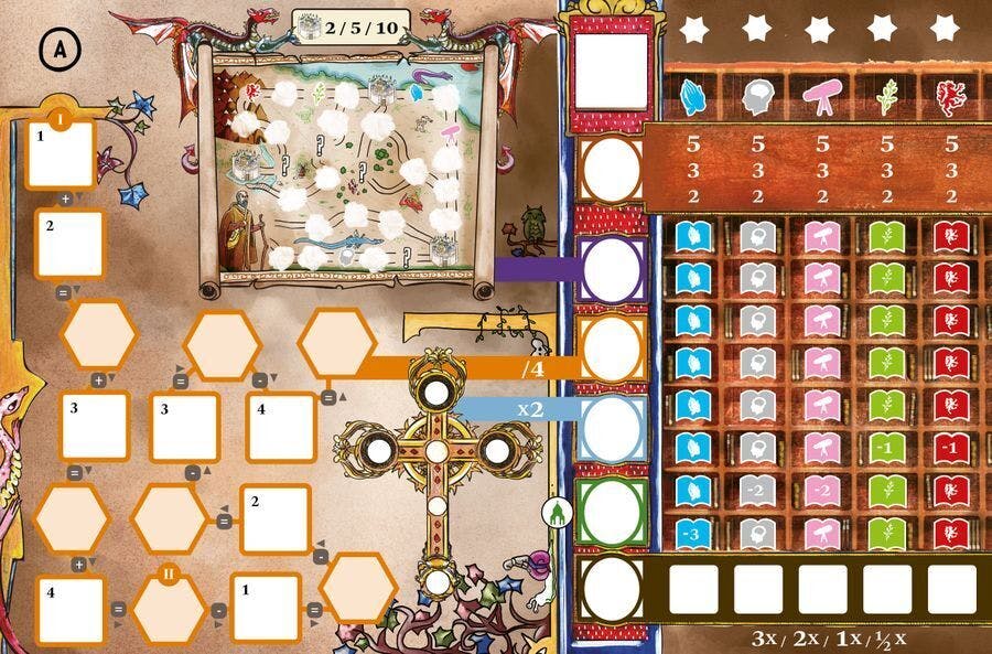 ゲームではサイコロを振って、影響力や写本の仕事や旅や祈りを通してスコアを集めます。2人以上でプレイする場合は前半と後半に分かれており、後半にオークションが開かれます。入札に使うのは、前半で得た影響力です。一人用ゲームモードではこれがありません。このオークションで得られるものはサイコロで、それによって達成できるアクションが異なります。使う影響力は後のスコアに繋がるため、駆け引きがとても重要になります!