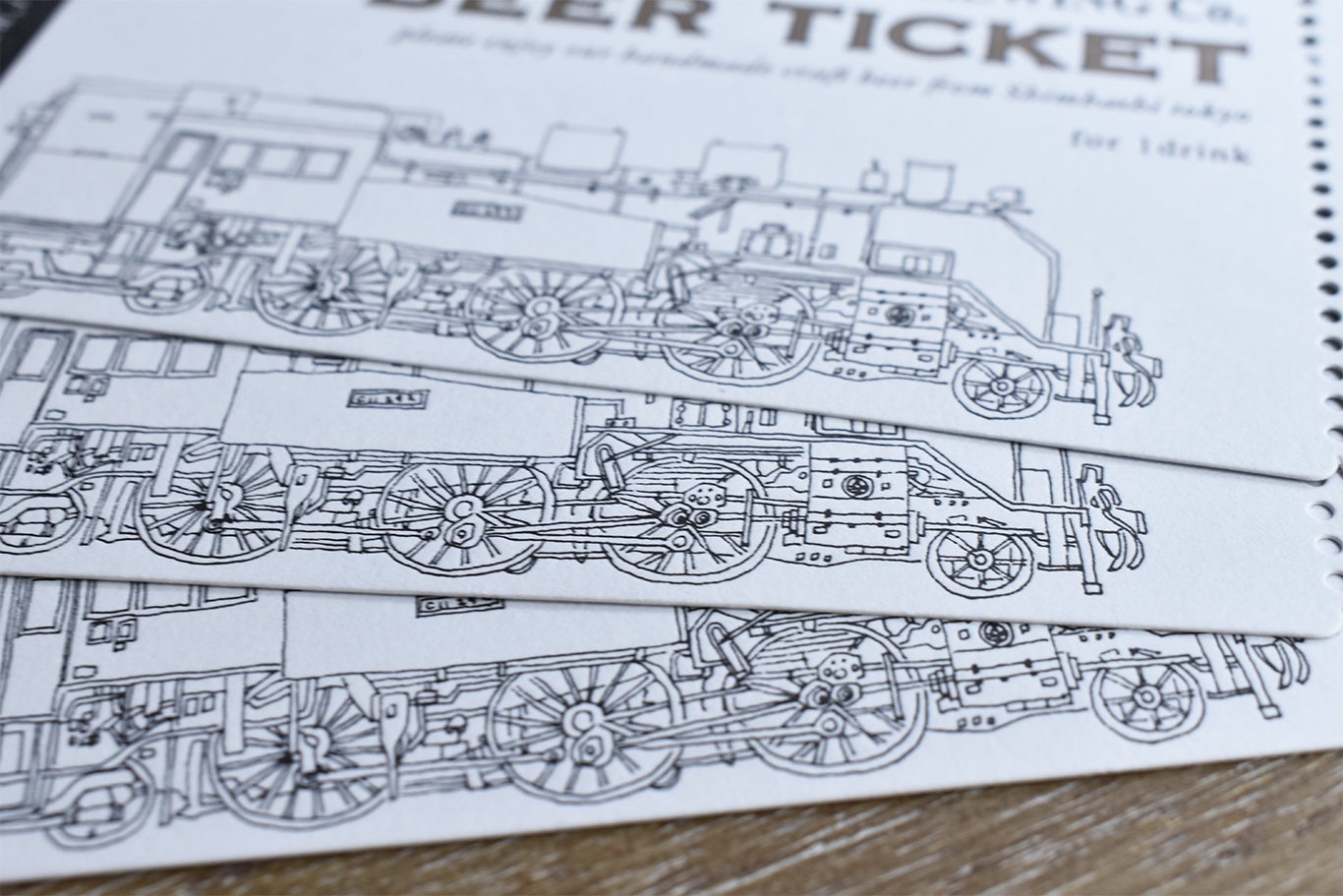 スタッフ池田系さん手書SLイラストを活版で印刷したビアチケットです