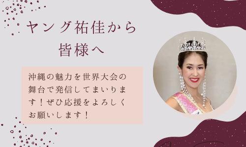 ミセスオブザイヤー沖縄大会事務局として、沖縄の女性の社会的活躍をサポートしつつ、自らから輝くことで周りを後押しするロールモデルを目指す。