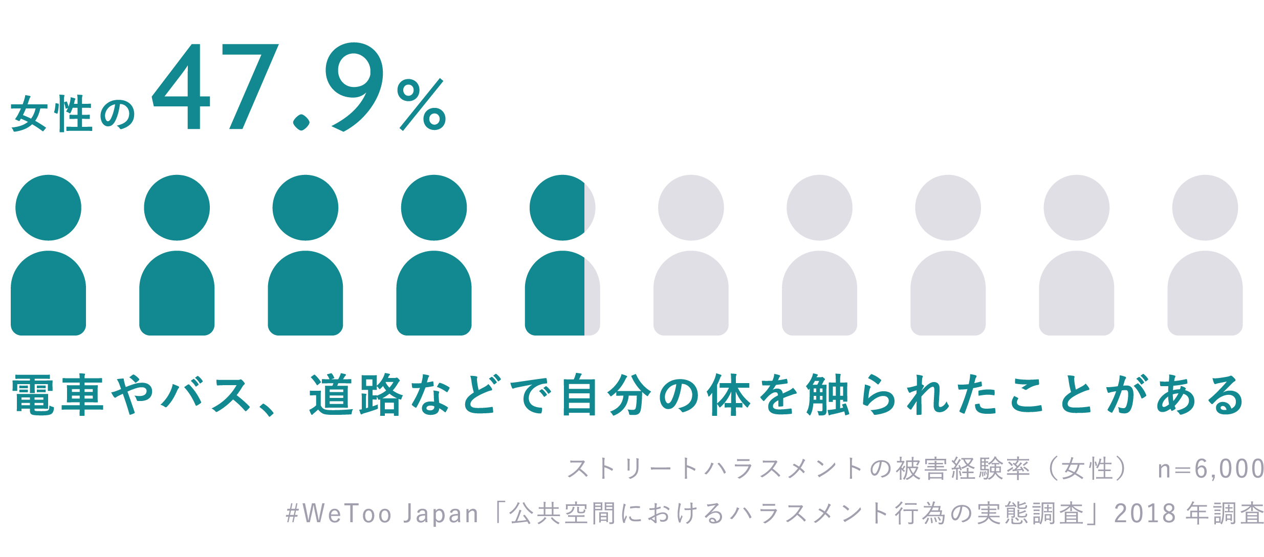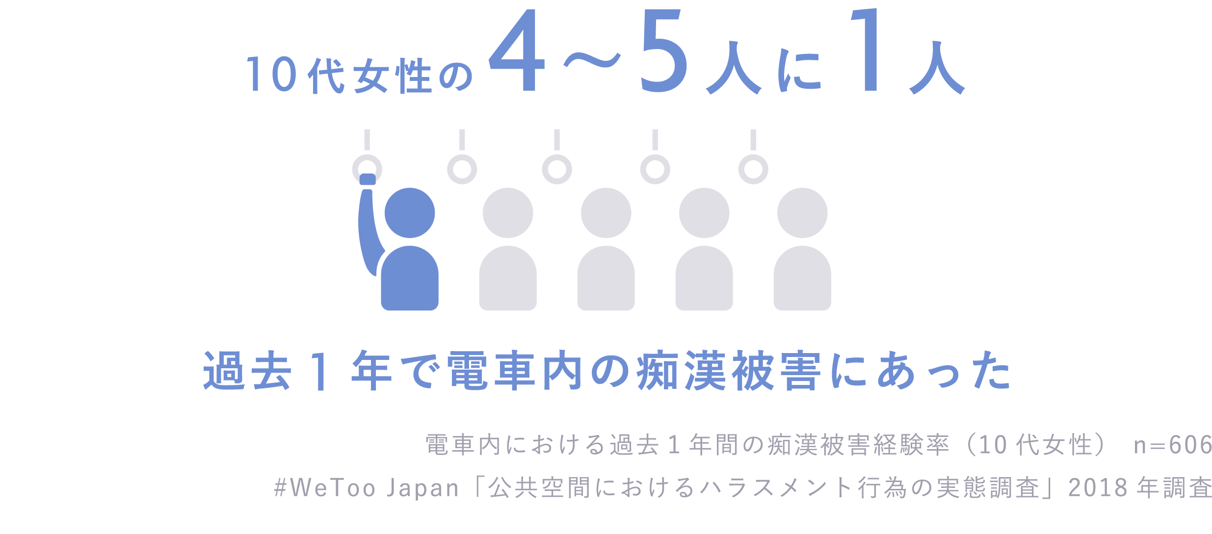 2018年に行われた#WeToo Japanによる調査によると、6,000人の女性のうち約半数、47.9%が「電車やバス、道路などで自分の体を触られたことがある」と回答し、中でも電車内において過去1年間で痴漢被害にあった10代女性は、22.9%と、およそ4~5人に1人でした。
