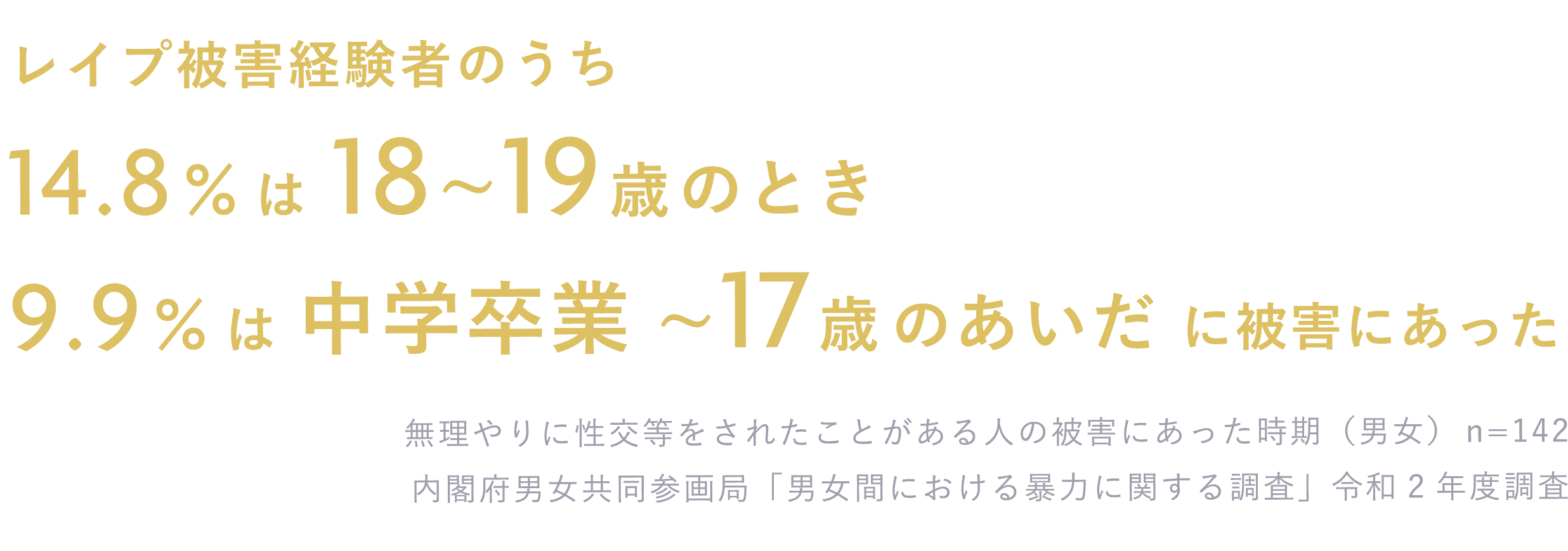 また内閣府の調査「男女における暴力に関する調査〈令和2年度〉」によると、レイプ被害にあった人のうち14.8%が18〜19歳のときに被害を経験しており、中学卒業から17歳のあいだに被害にあった人も、9.9%にのぼります。