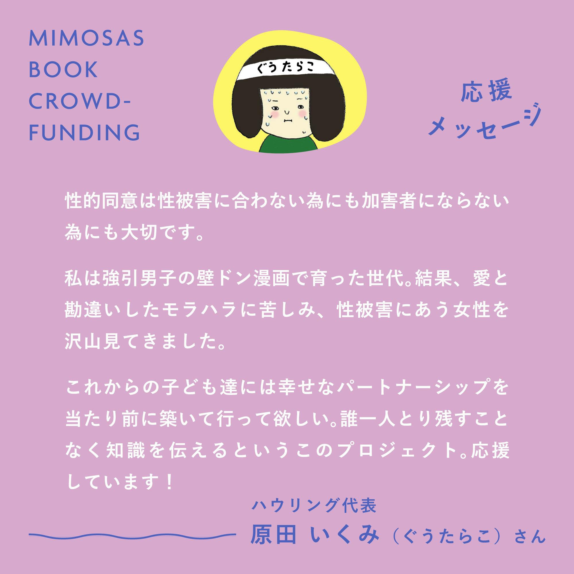 2022/04/11 21:33皆様、NPO法人mimosasのプロジェクトにご協力いただきありがとうございます。おかげさまで、『MIMOSAS BOOK』のプロジェクト、現段階で2500人の中高生に無料で『MIMOSAS BOOK』を配布できる金額まで到達いたしました!※こちらの冊数は、目標金額を達成した場合の計算となります。1冊でも多く冊子を作ることで、1冊あたりのコストを下げられるため、さらに多くの中高生に配ることができます。(4/11計測時点)。今回のクラウドファンディングの目標は、2,000人の中高生への無料配布を目指して開始ましたが、現時点ですでに5000冊を超える配布希望のお問い合わせをいただいております!クラウドファンディング終了日まで、残り3週間を切りました。1人でも多くの中高生に、性的同意や性被害について必要な情報を届けるために、引き続き、拡散とご支援のご協力をよろしくお願いいたします。また、学校関係者等で『MIMOSAS BOOK』配布を希望される方は、クラファンページ本文の問合せフォームからご連絡いただけますと幸いです。 もっと見る