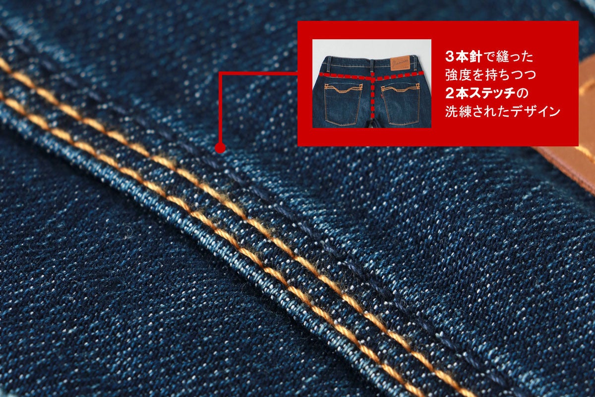 バックポケットを縦長にし、飾りステッチの位置を高くすることで脚長見えする作り。