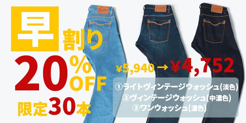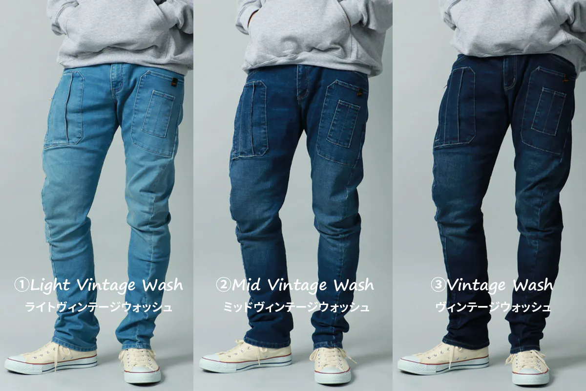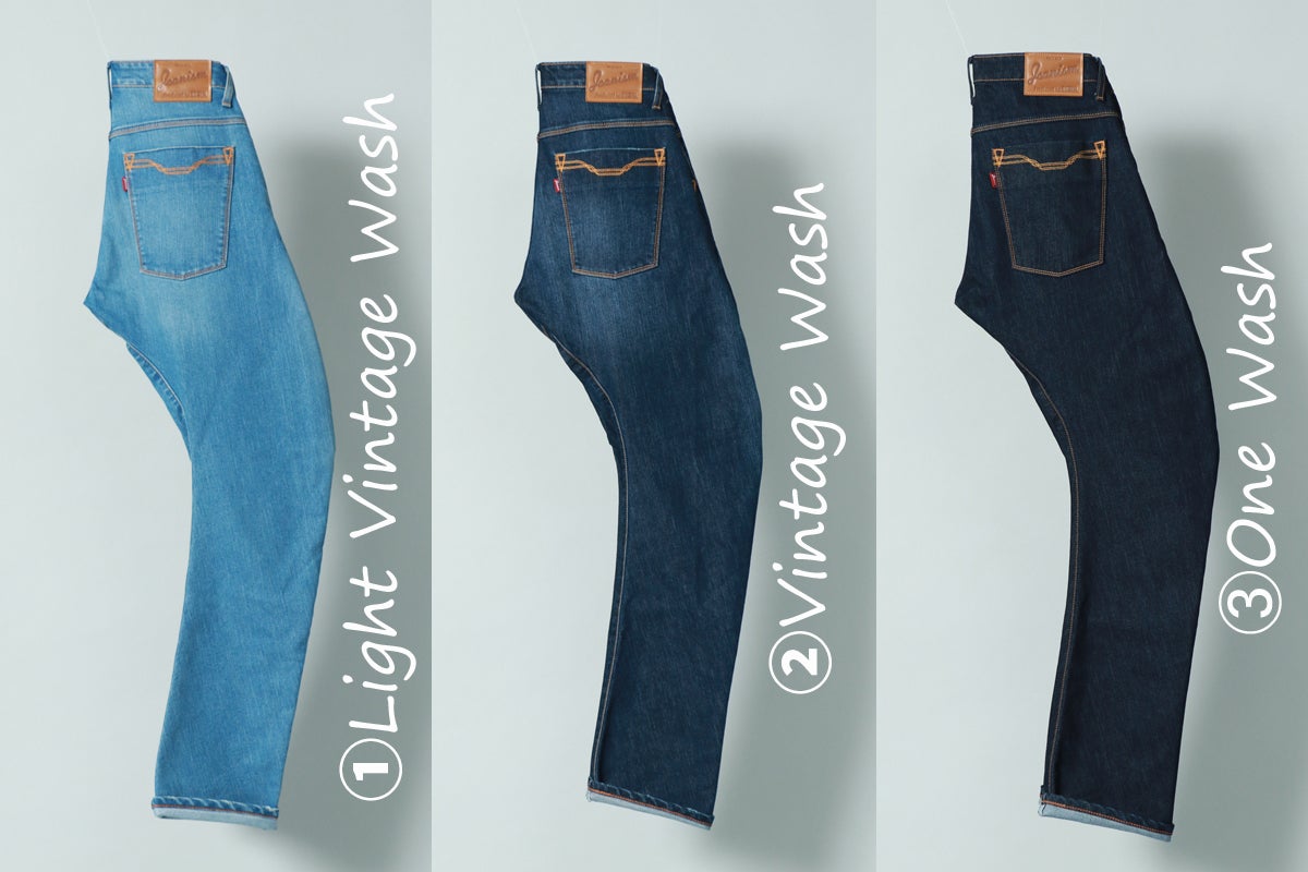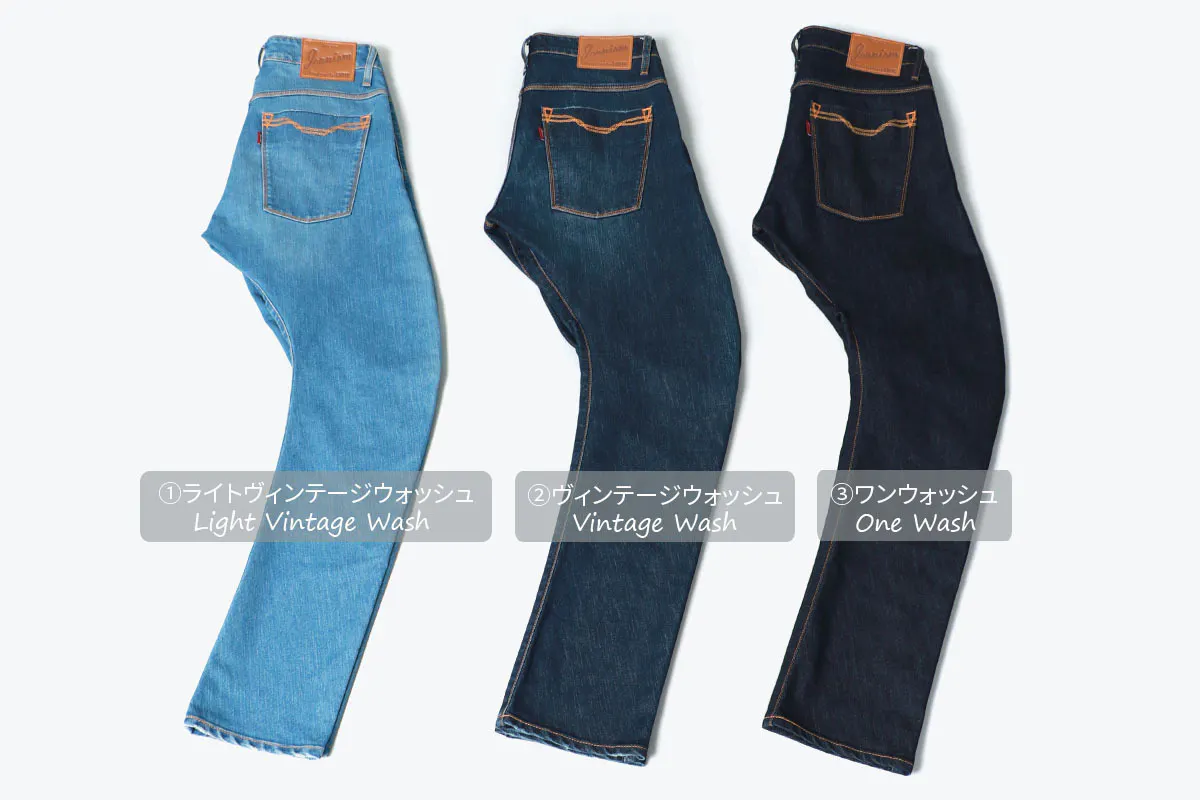 *カラー:[①ライトヴィンテージウォッシュ、②ミッドヴィンテージウォッシュ、③ヴィンテージウォッシュ]の3色展開