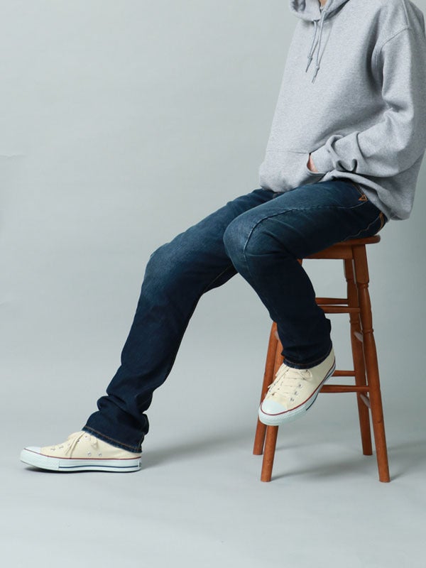 曲げたヒザにナチュラルに沿ってきれいなシルエットを保ちます。座った姿勢でも一部が突っ張ったりしないのでストレス無くきれいな見た目でかっこよくジーンズを楽しめます。