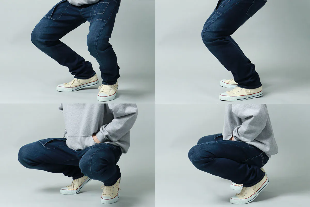 立体裁断製法と微弱ストレッチによって、屈伸が窮屈にならず、ヒザの曲げ伸ばしも快適です。