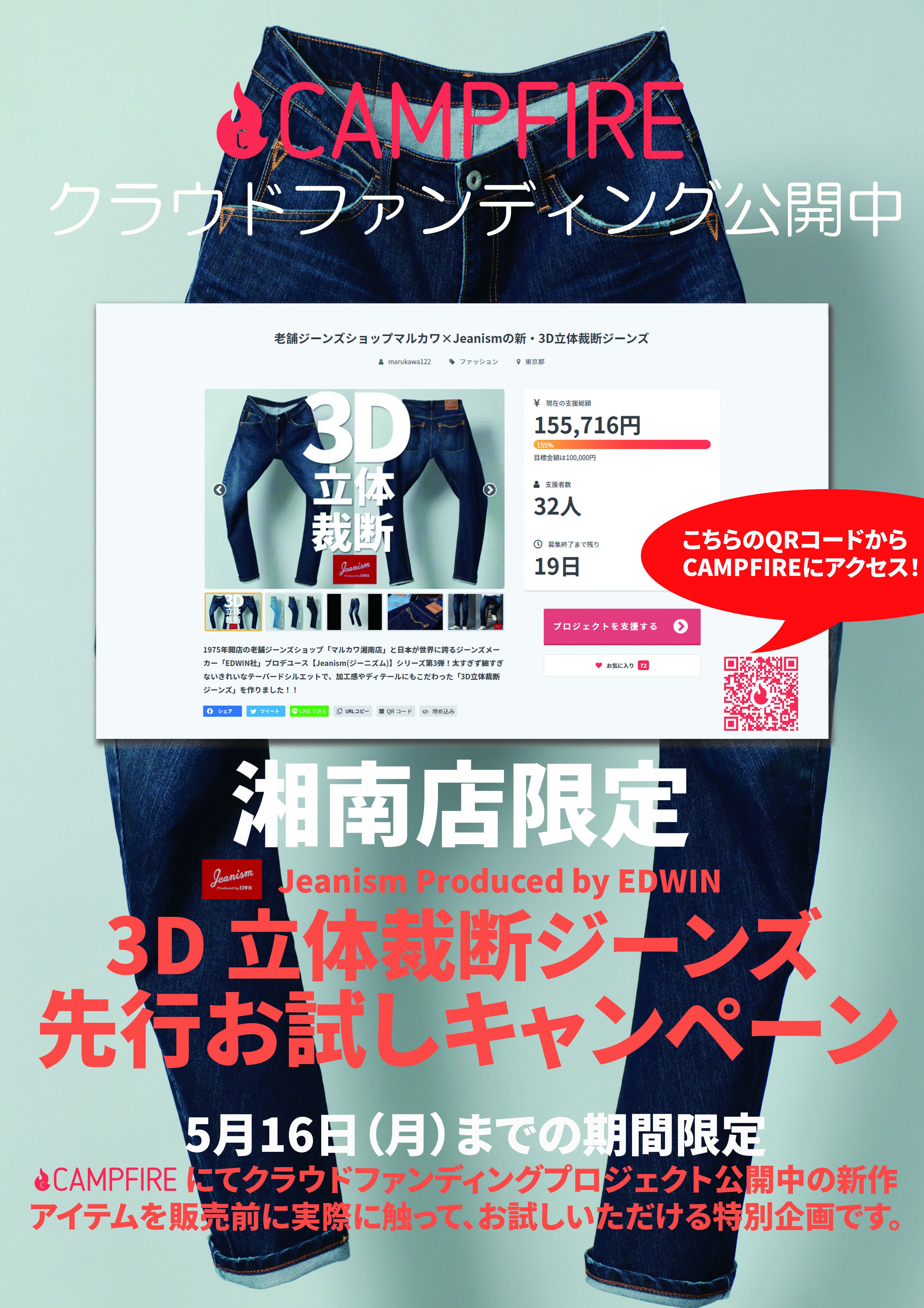 ジーンズショップマルカワ湘南店におきまして、ただいま絶賛公開中の【ジーニズム3D立体裁断ジーンズ】が試着できるキャンペーンを実施致します!!