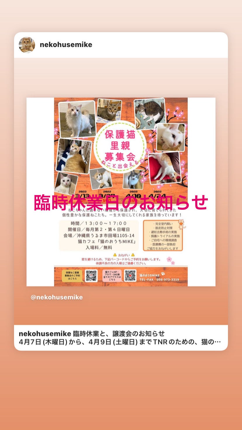 臨時休業と、譲渡会のお知らせ4月7日(木曜日)から、4月9日(土曜日)までTNRのための、猫の搬送と、シェルター寄りの、引っ越し準備のためお休みします10日譲渡会は、予定通り行います、尚日にちは未定ですがコンテナハウス完成猫の移動すみましたら、内覧会を予定していますよろしくお願い申し上げます。