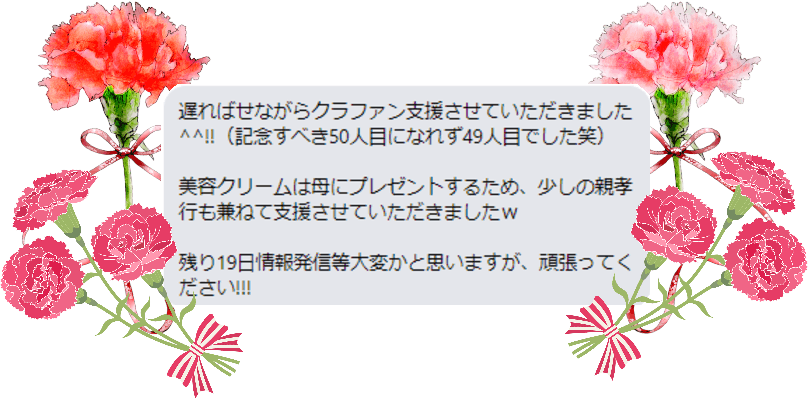 で、クリームの宣伝をしようと思っているわけではなく(宣伝しちゃいましたが^ ^;)、母の日のプレゼントにしてくれたことや、こういう温かいメッセージをくださったことや、クラファンを応援して下さったことが、本当にうれしいのです。