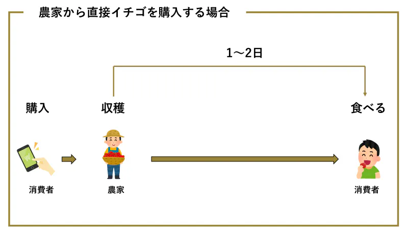 一方、農家から直接購入したイチゴは、お客様から注文を受けた後で私たちが収穫し、その後直接お客様の元へ輸送されます。そのため、収穫してから1日~2日程度しか経過していません。