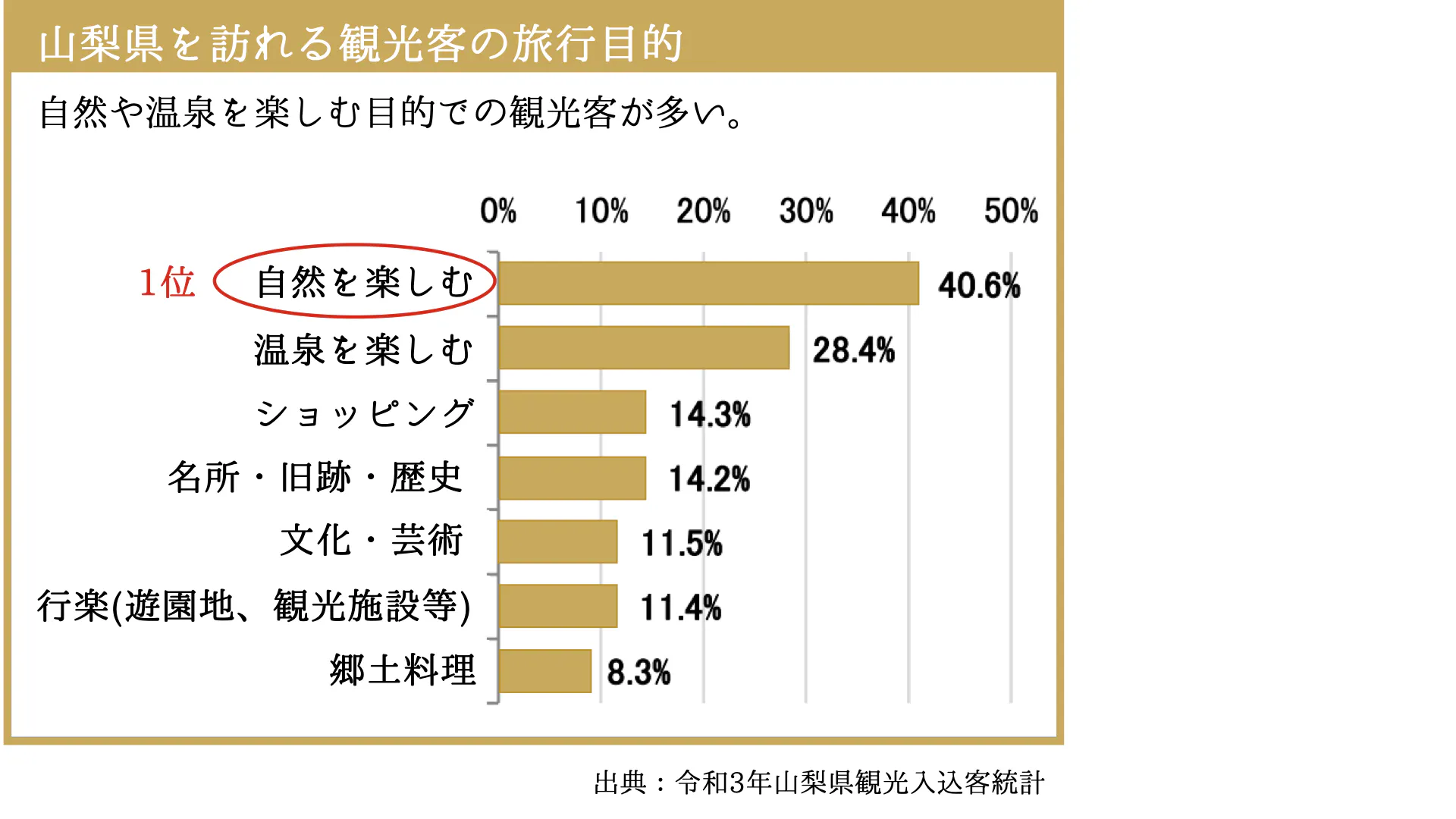 調べてみると、山梨県に訪れる観光客の旅行目的は『自然を楽しむ』が1位で40.6%だそうです。県外の方は山梨県の豊かな自然に魅力を感じているのですね。