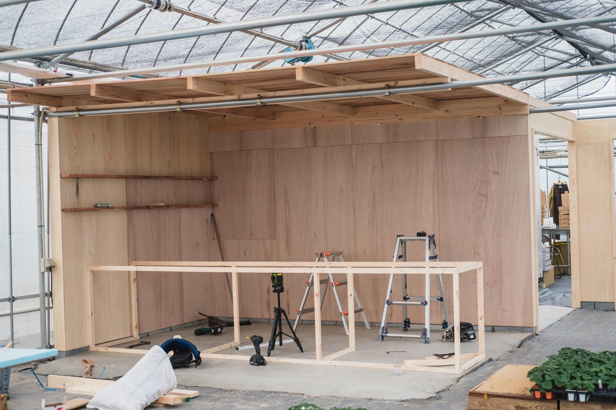 水平と垂直はレーザーで確認しながら組み立てます。