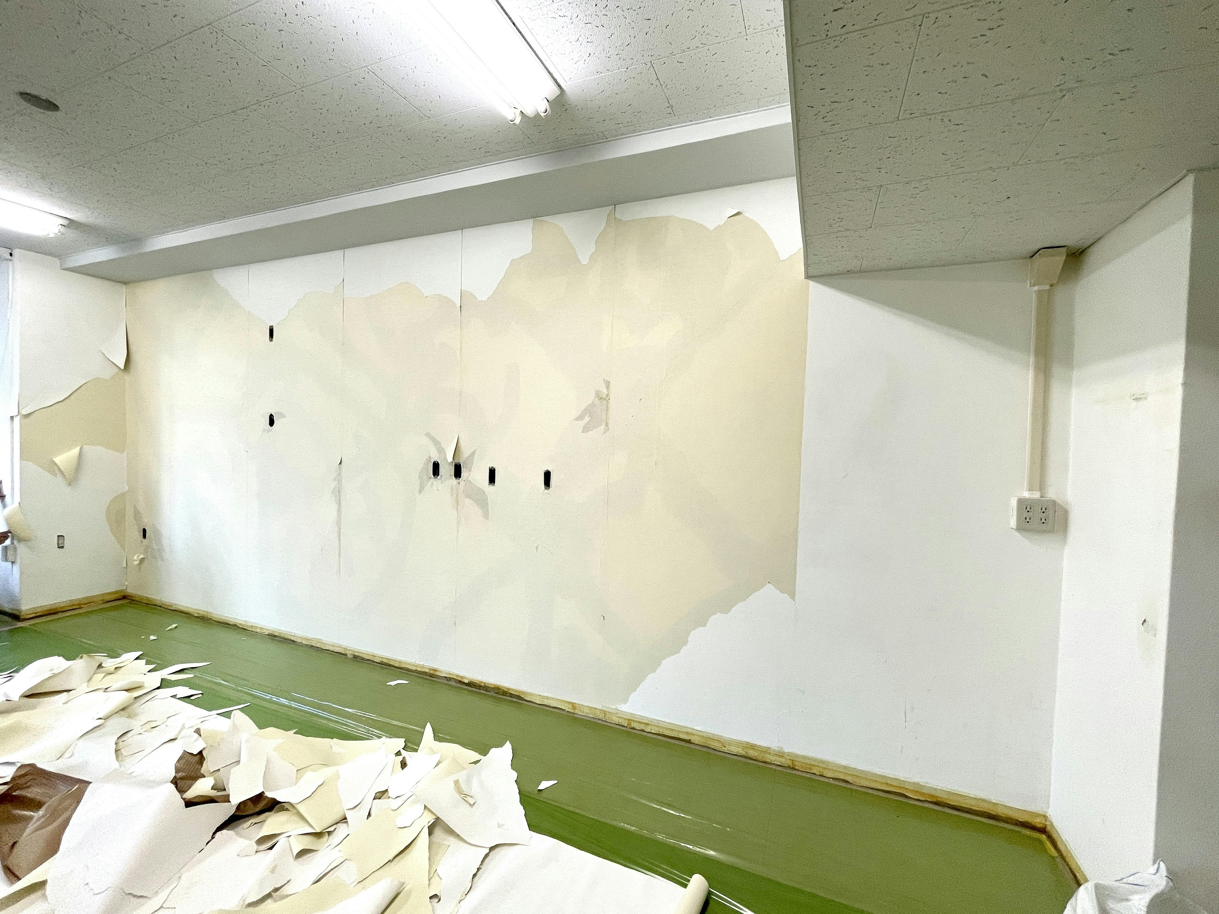 バリバリ剥がしてもらっています!こちらは幅広の白い壁になります!