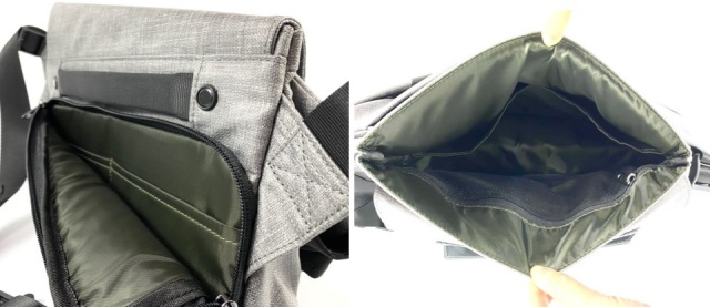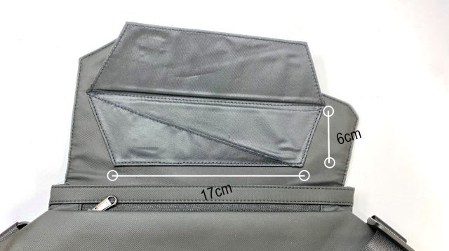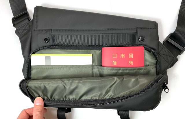 バッグの背面には、ジッパー付きのコンパートメントがあります。中を開けると小ポケットが2つ付いています。銀行通帳を横にして、パスポートを縦に収納可能です。