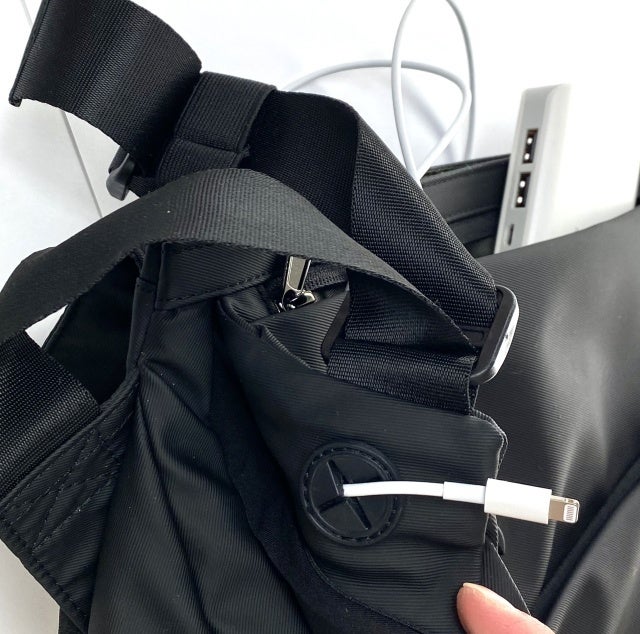 メインコンパートメントの手前にあるファスナーつきの区画です。中には2つの小ポケットがあります。モバイルバッテリーを収納すれば、専用のケーブル穴を通して、通話をしながら充電することも可能です。
