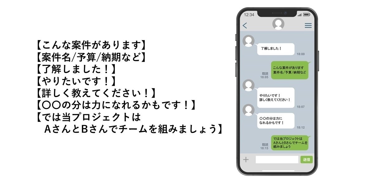 クリエイターファイル内の業務に当てはまらないケースでは、専属コンサルタントが協会LINEグループ内で案件内容を発信し公募することもあります。 この場合、クリエイターファイルに提示している定価は適用されず、案件ごとに予算や納期の調整を行います。