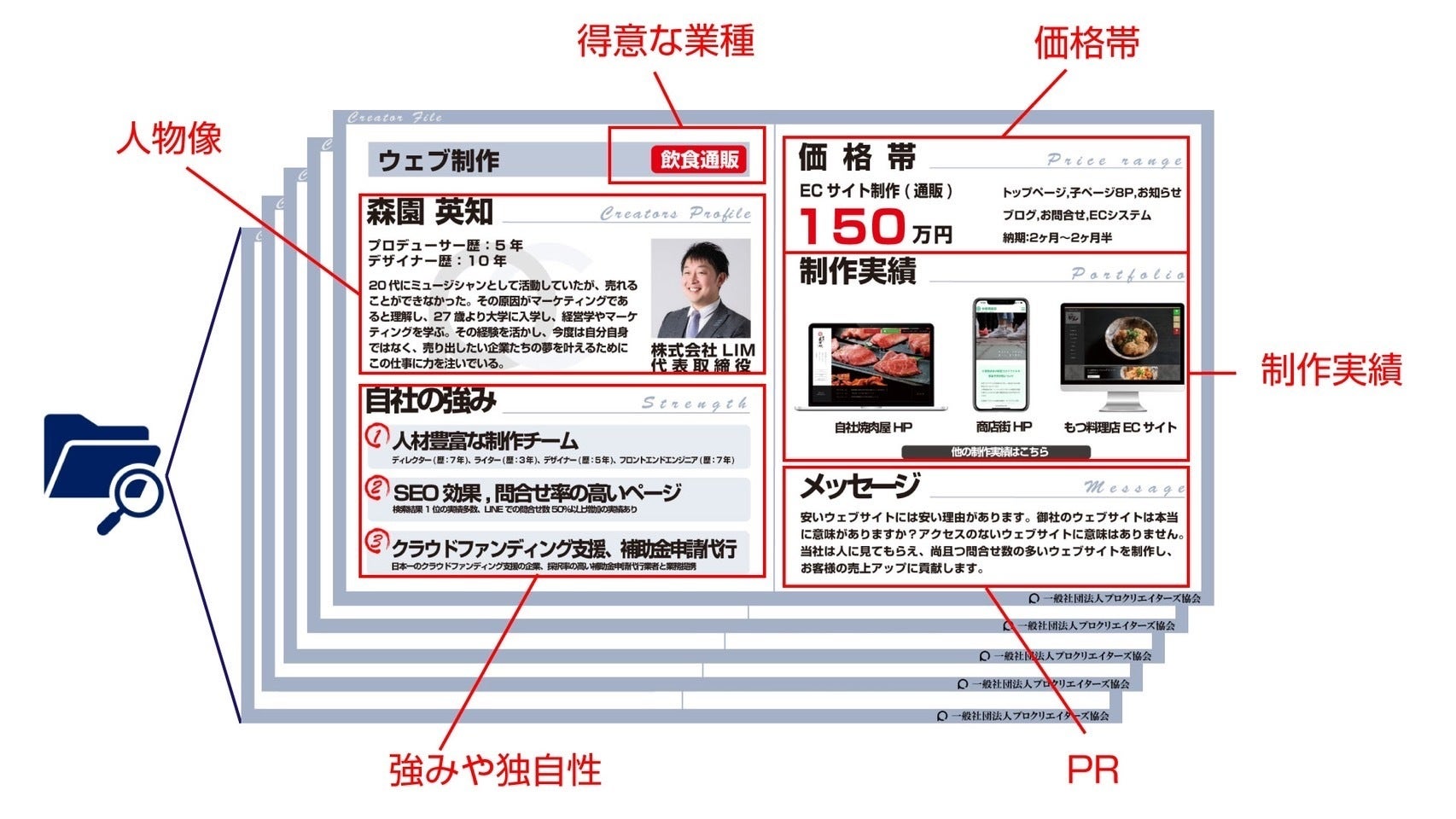 WEBデザイナー、WEBライター、カメラマン、動画クリエイターなどWEBのプロクリエイターは厳正な審査のあと『一般社団法人プロクリエイターズ協会』に登録され、クリエイターファイルでデータが管理されます。
