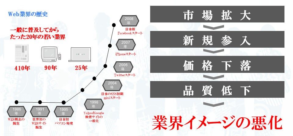 調べてみると、新聞が世界に普及して410年、テレビは90年の長い歴史がありますが、WEBはたったの25年。日本で一般家庭用のパソコンが発売されたのが1995年で、検索サイトが一般化したのが1998年。