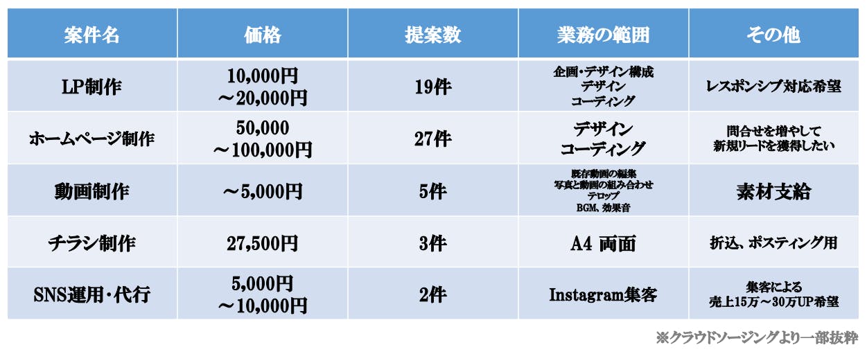 クラウドソーシングの募集案件を見ると、例えばWEBライターは1文字1円未満、WEBデザイナーはアイコン・バナー作成が3000円といった価格崩壊が起きています。