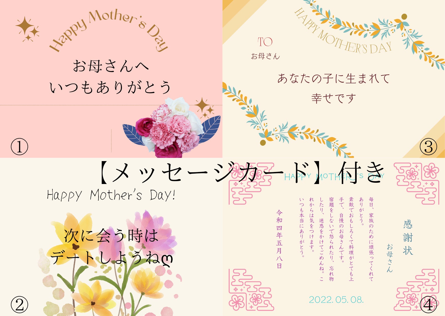 ・1.ピンク 2.花畑 3.ガーランド 4.感謝状 5.メッセージなし…各商品一覧のオプションよりお選び頂けます。