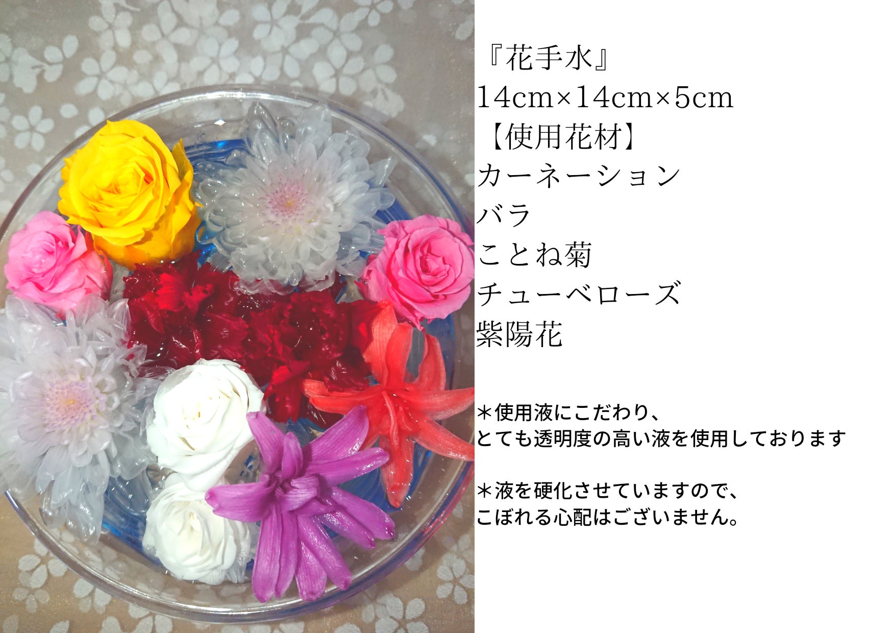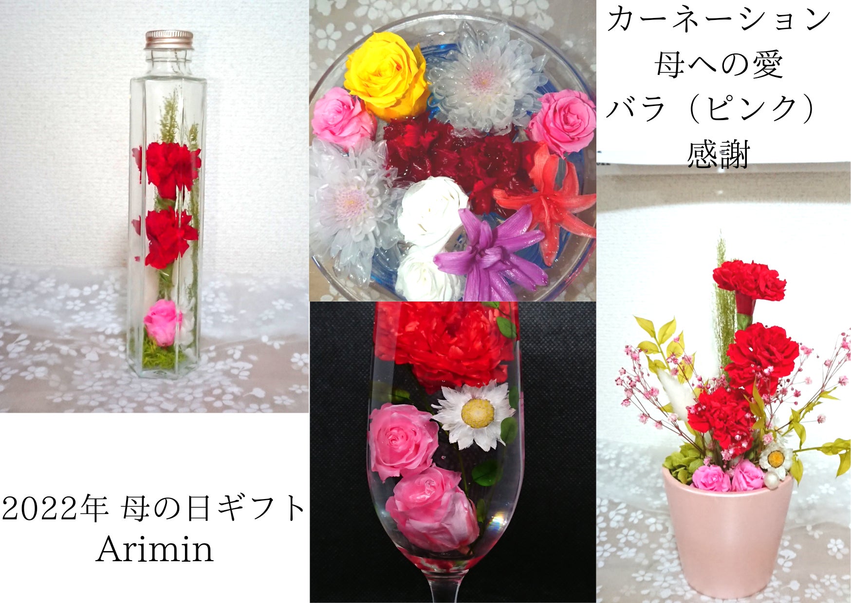 とても母の日らしいデザインになりました。オイルは透明度の高いシリコンオイルを使用しておりますので、観賞期間も1年ほど楽しんで頂けます。