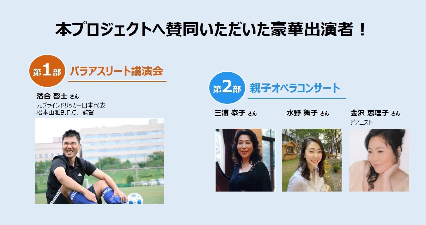 こども達と同じく、障がいを持ちながらもいきいきと活躍されているパラアスリートの「落合啓志」氏をお招きしての講演や、プロのオペラ歌手やピアニスト、ダンスなど本格的な音楽をご家族で一緒に楽しんでいただきます。