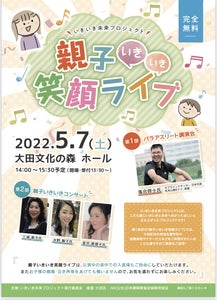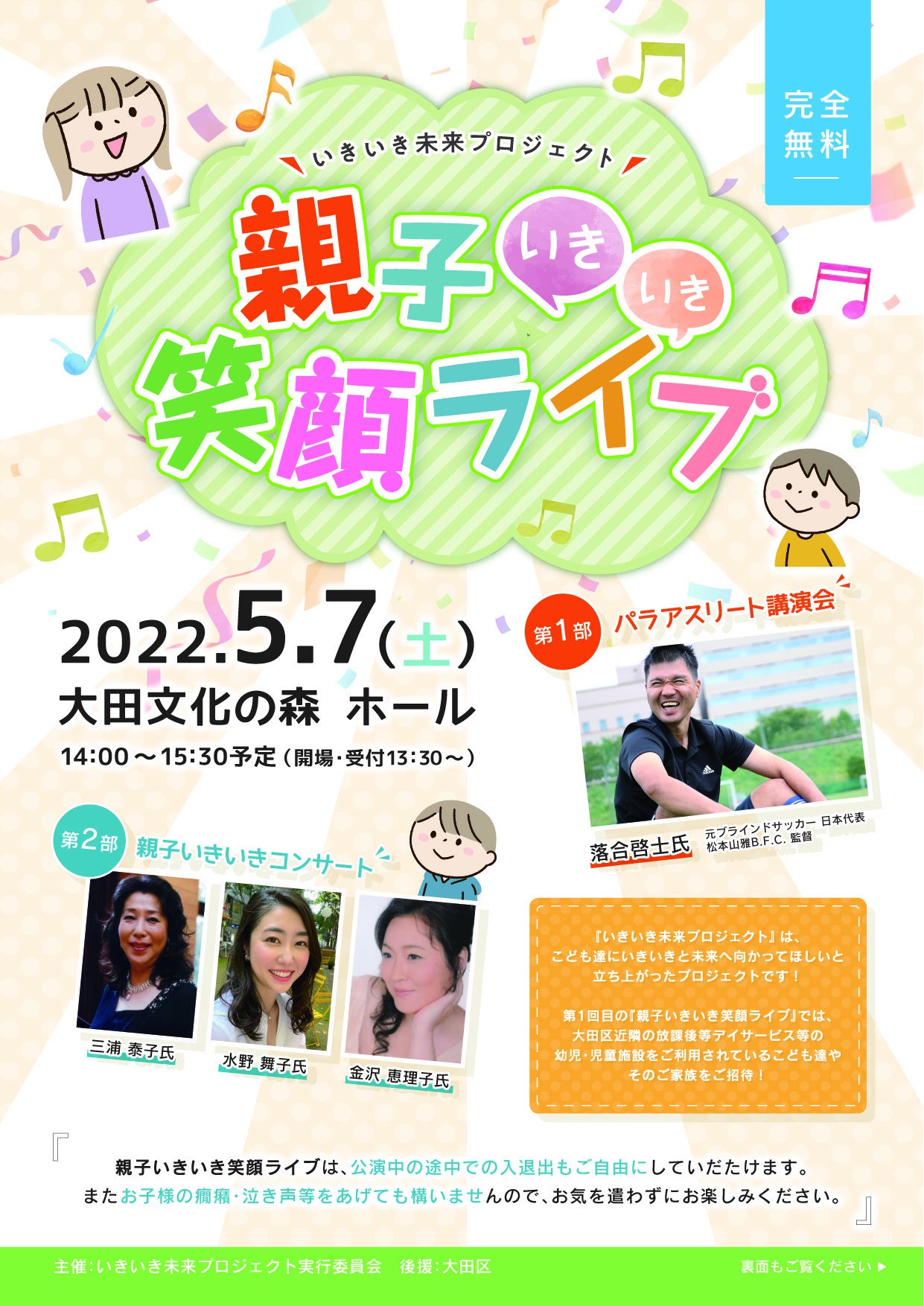 2022年5月7日(土)14時~15時半、大田区文化の森ホールで大田区の児童福祉施設のこども達やご家族をご招待した【親子いきいき笑顔ライブ】を開催します。