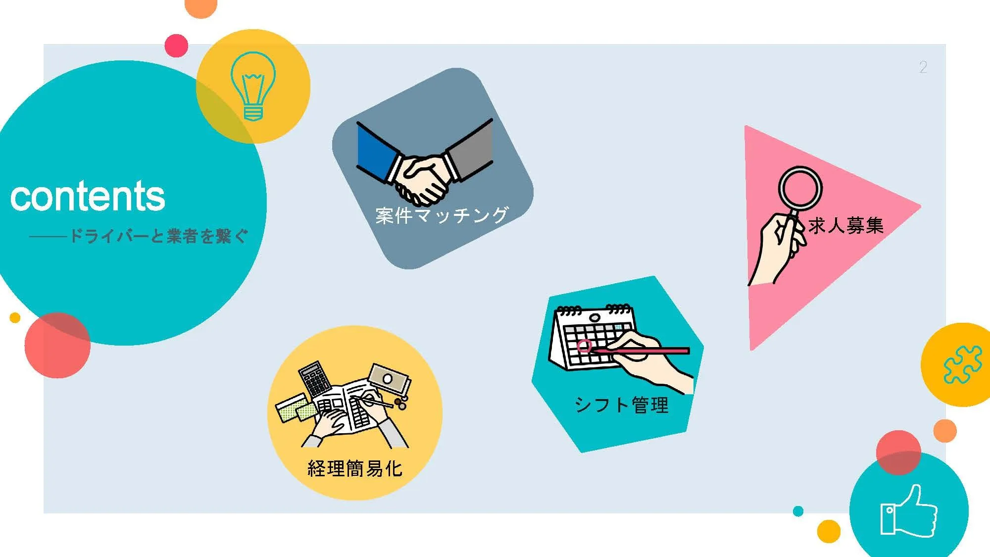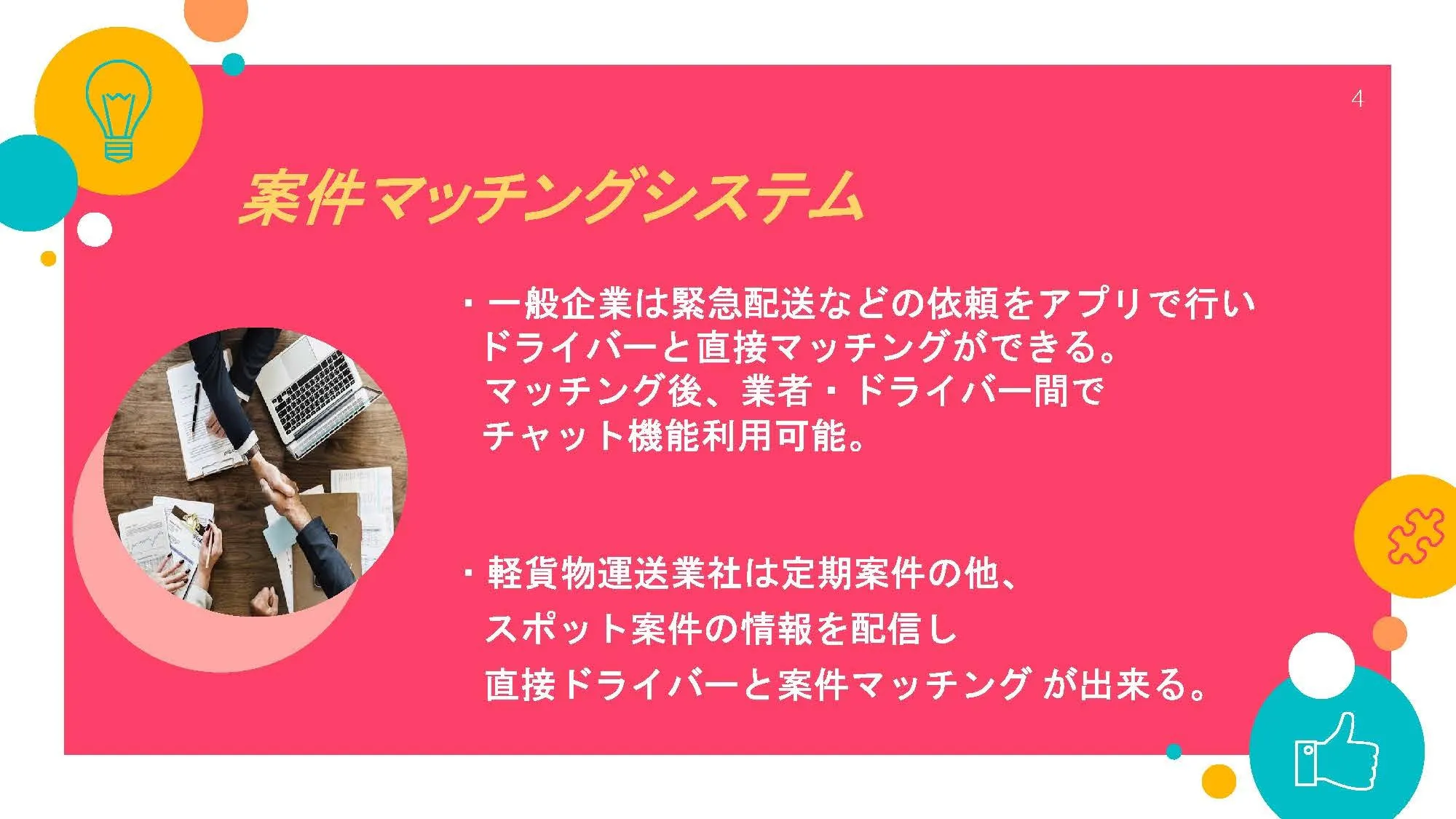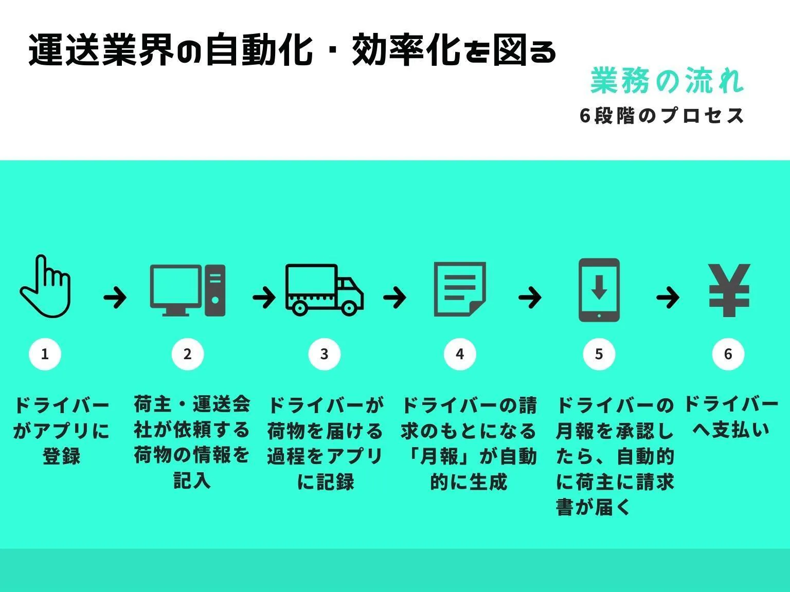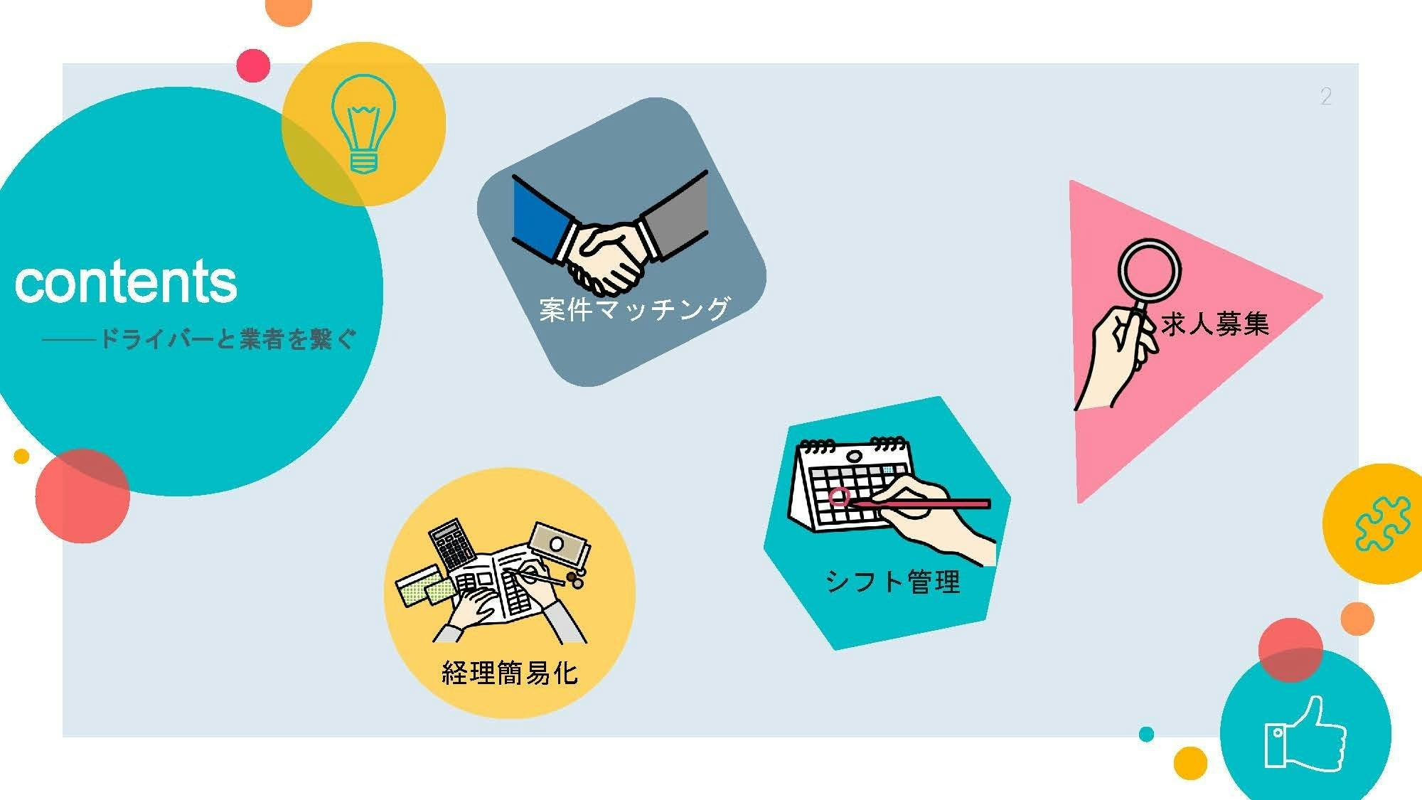 ドライバーと運送業者、荷主の会社が三方よしで仕事を進めるためのアプリをつくることで、3者の業務効率を測り、仕事をしやすい、仕事を頼みやすい環境をつくります。