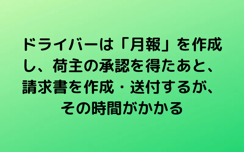 運送会社は、基本的にドライバーに、依頼した案件の配送実績を記録した「月報」をもらわないと、クライアントへの請求書作りや、ドライバーへの代金を支払う計算ができません