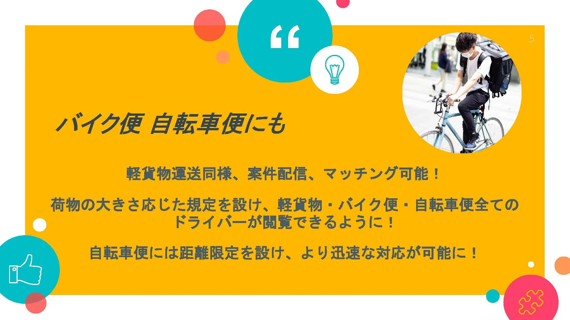 距離が短くて、大きさや重さも小さければ「軽貨物」「バイク便」「自転車便」、距離が長くなれば「軽貨物」「バイク便」、大きさや重さも大きくなれば「軽貨物」とドライバーが閲覧できる仕組みを取り入れる予定です。