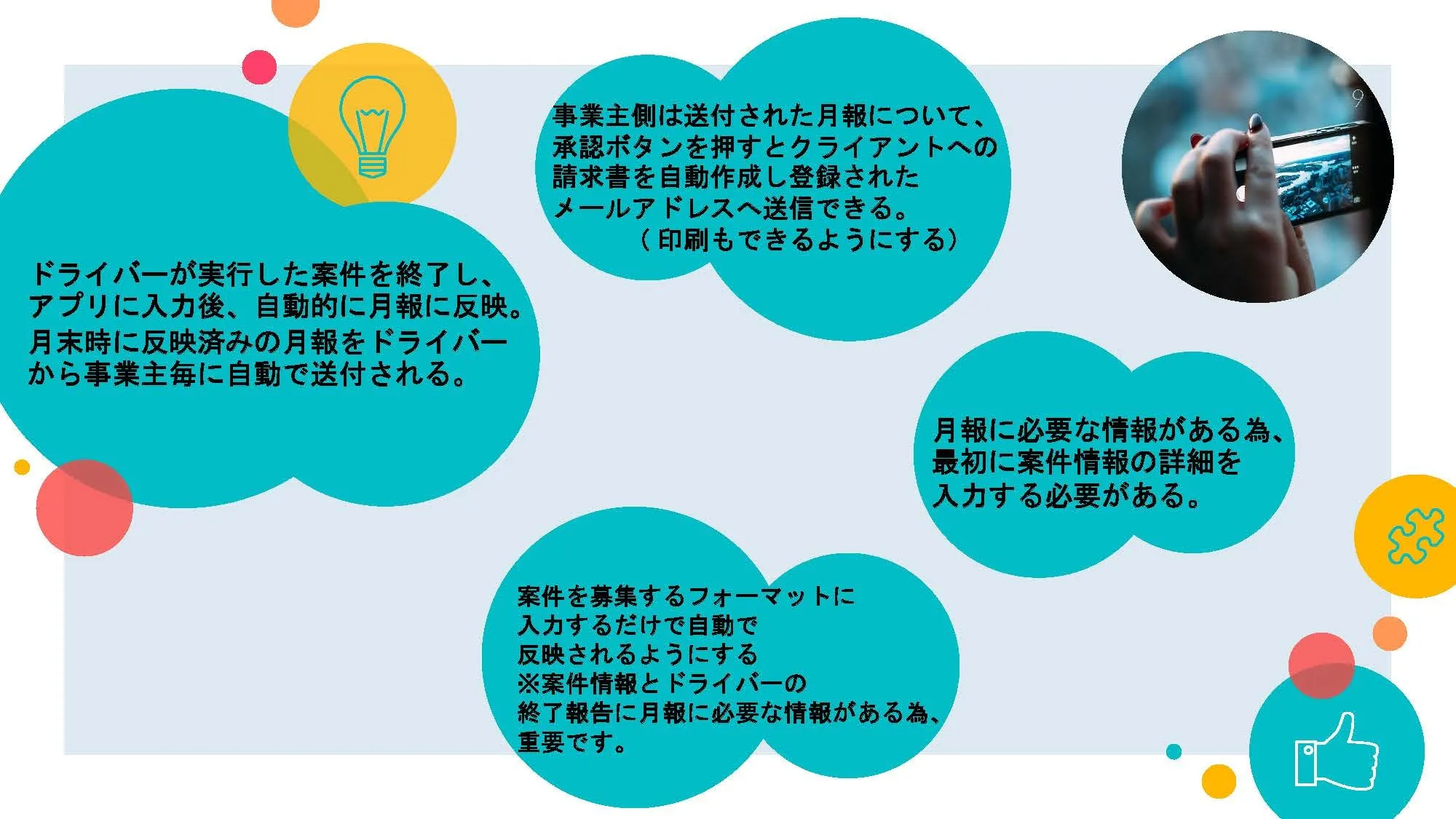 機能の一例ですが、配送データが蓄積され、ドライバー要作成の「月報」が自動的に生成され運送業者に自動で送付され、それを運送会社が承認したらクライアントへの請求書ができたらとても便利だと考えました。