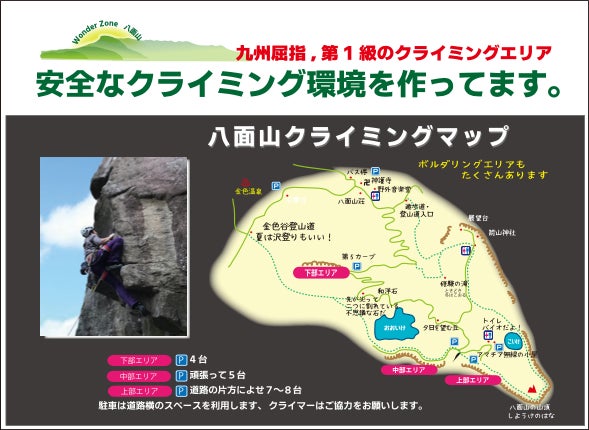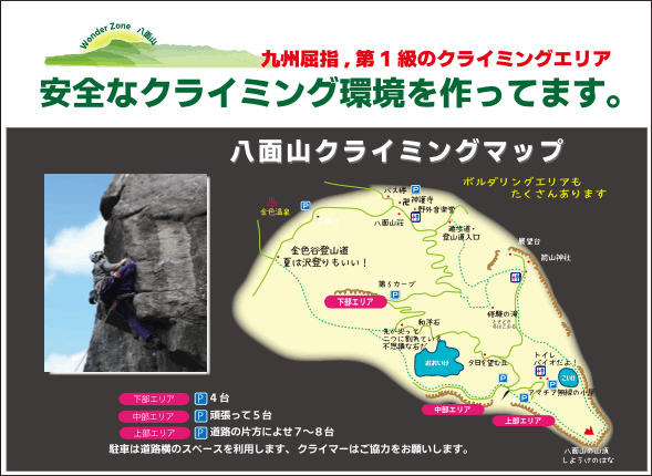 八面山クライミングエリアまでの所要時間は中津市内から30分以内、福岡市内からも2時間です。現在、工事中のなかつ日田道路が完成すればさらに利便性は増し、クライミングを通して地域振興に貢献するものと確信しています。