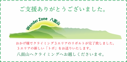 リボルト職人養成講座の受講者を主軸に令和3年9月よりリボルト開始、下部エリアから始め今は中部エリアの作業に入る。開始にあたり募金を募り、クライマー諸氏より50万円余りのご厚志を頂きましたが八面山の岩質上ケミカルボルト使用の部分が多くまだまだ費用がかかります。今回このプロジェクトを立ち上げて広く皆さんに呼びかけ作業を進めたいと思っています。