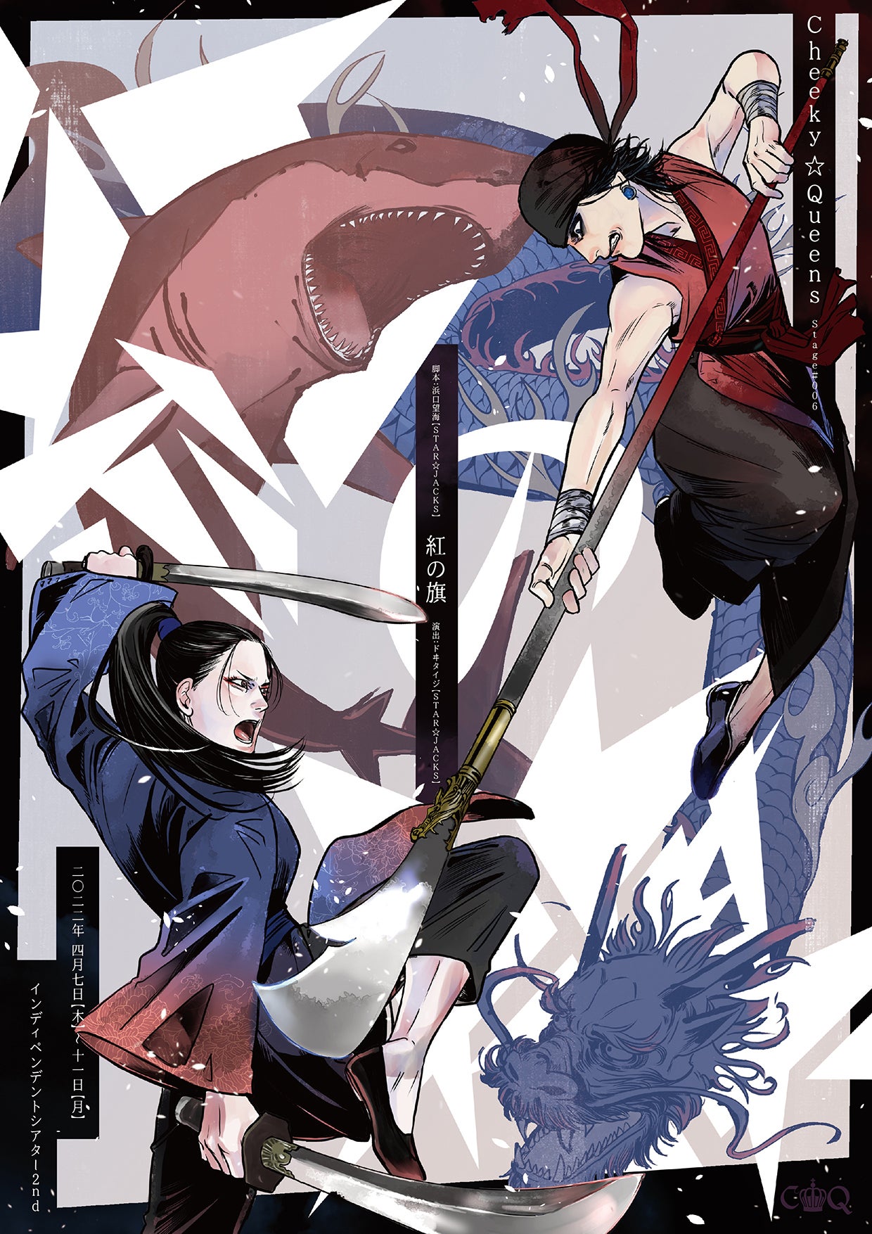『紅の旗』キャストビジュアルが公開になりました!畠山薫(Cheeky☆Queens) as 九蘭(クラン) 清国海軍が海賊団・紅鮫(ホンジャオ)に送り込んだスパイ。 三原悠里(Cheeky☆Queens) as 小芳(シャオファン) 紅鮫が清国海軍に送り込んだスパイ。 赤松英実(Cheeky☆Queens) as 韓(ハン)豊毅の側近 留奈(Cheeky☆Queens) as 静(ジン)九蘭の一味 徳永健治 as 豊毅(フォンイー)海賊団・紅鮫を率いる頭目 うえだひろし(リリパットアーミーⅡ) as エドワード・李(リー)紅鮫を追い出された元海賊。東インド会社と組む。さぶりな(IsLand☆12) as 湯(タン) 志玲の下で働く女 & 小芳の母 野村洋希 as 黄(ホアン)九蘭の一味 下浦貴士(STAR☆JACKS) as 胡(フー)周徳賢の秘書官 橫濱康平 as 孫(ソン)海軍将校 山田命 as 雪(シュエ)九蘭の一味 璃生 as 王成龙(ウォン・チェンロン)海軍少校。若きエリート。工藤彰彦(本若) as アンサンブル楠木健吾 as アンサンブル松永和真(劇団エクステ/松永企画) as 劉(リュウ)九蘭の一味 大西敦司 as 梅宗臣(メイ・ゾンチェン)海軍大尉 悠木基義 as 天(ティエン)リンジーの従者 平田莉渚 as 幼少期の小芳北田結子 as 幼少期のリンジー古賀柚奈 as 春燕(チュンイェン)九蘭の一味 小山栄華(アナグマの脱却座) as 董(ドン)紅鮫の海賊 西條 as 趙(ジャオ)紅鮫の海賊 佐々木瞳 as リンジーイギリス東インド会社総督の娘 染谷優波 as アンサンブル武隈玲衣夏 as アンサンブル常盤ななみ as 候(ホー) 妹豊毅配下の殺し屋 七星 候(ホー) 姉豊毅配下の殺し屋 西田杏奈 as 希维(シウェイ)志玲の下で働く女 益田杏花(彗星マジック) as 瑤(ヤオ)志玲の下で働く女 山下真実 as 梁(リャン)紅鮫の海賊 和柯 as アンサンブル生田朗子 as 志玲(チーリン) 酒場の女主人。周徳賢の元妻。【特別出演】角田信朗 as 周徳賢(シュウ・ドゥシェン) 海軍中将どうぞお楽しみに!!!